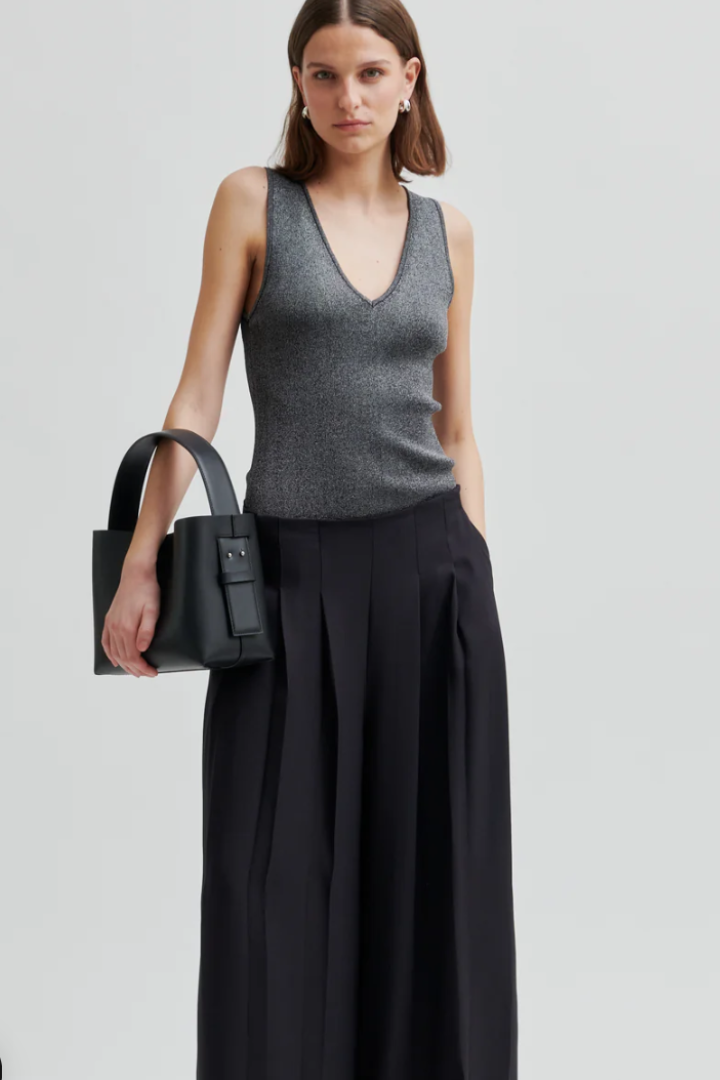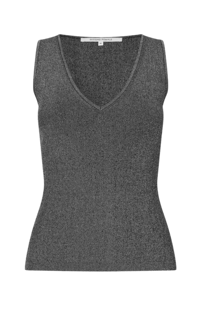 Second Female ribbed sleeveless top. The top is made in soft, stretchy ribbed fabric with glittery appearance. Featuring a deep V-neck. Slim fit.