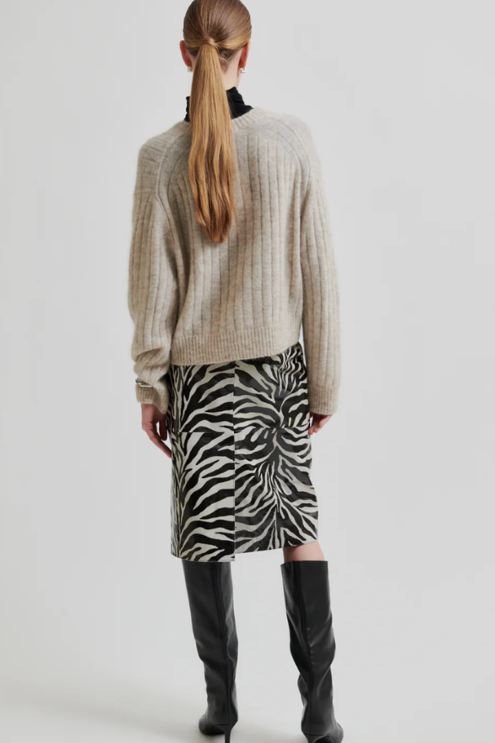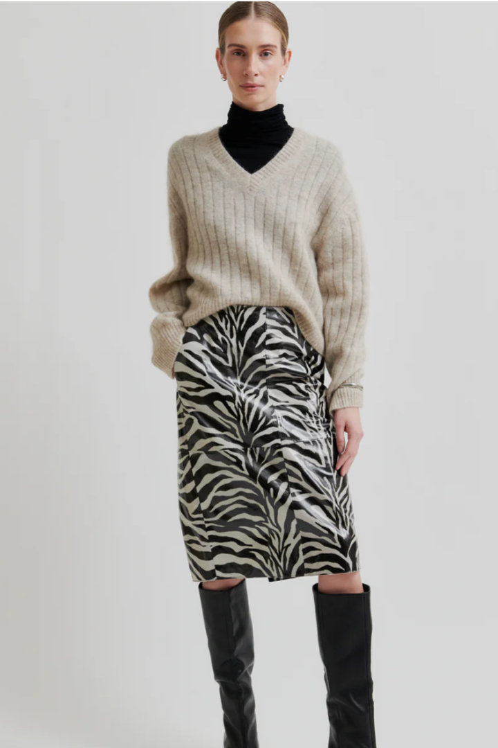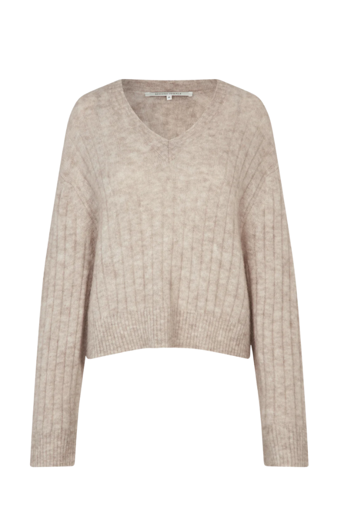 Second Female ribbed V-neck pullover. Made in a soft and stretchy mohair-wool blend with slightly fluffy texture. Featuring a V-neckline and dropped shoulders with long sleeves. Neck, cuffs and bottom hem in finer rib. Relaxed, slouchy fit that is comfy to wear.