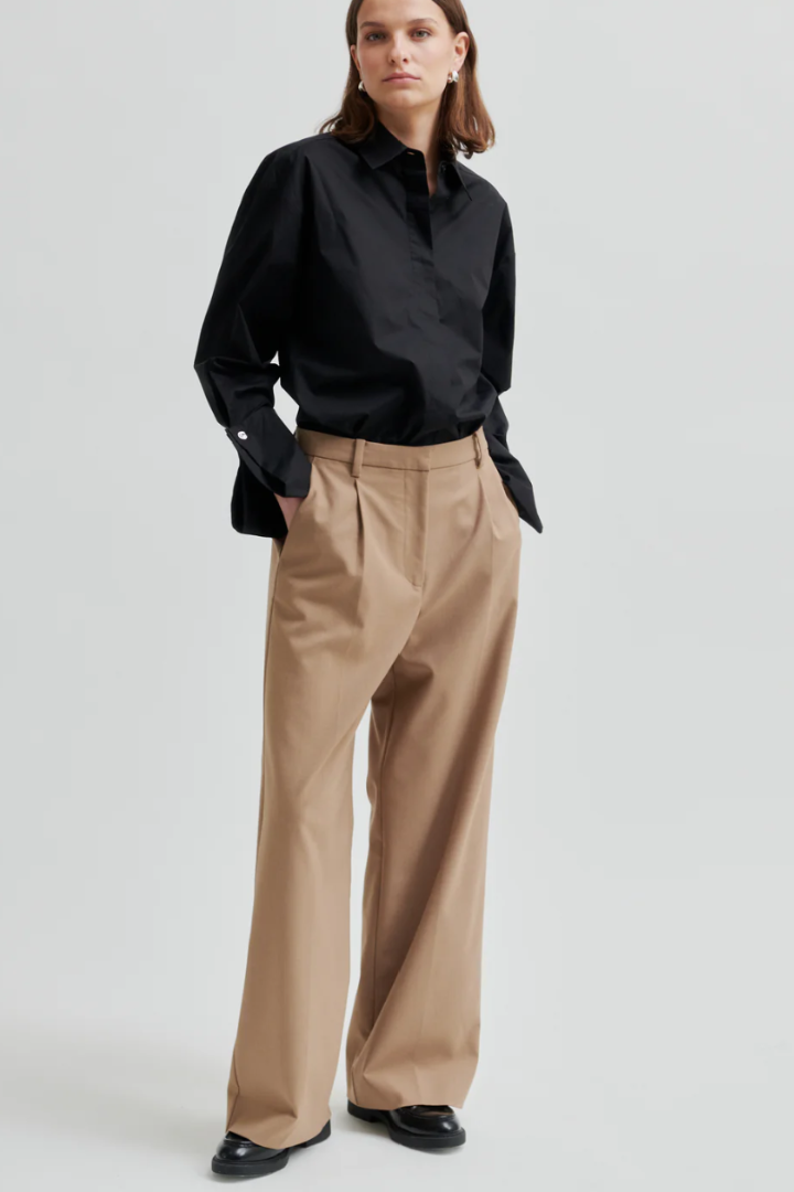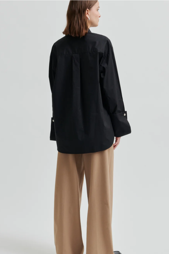 Second Female oversized shirt. The shirt is made in lightweight, smooth organic cotton. Featuring a regular collar and concealed button-through fastening. Long sleeves with extra wide double cuffs and detachable cufflinks. Wide, loose silhouette.