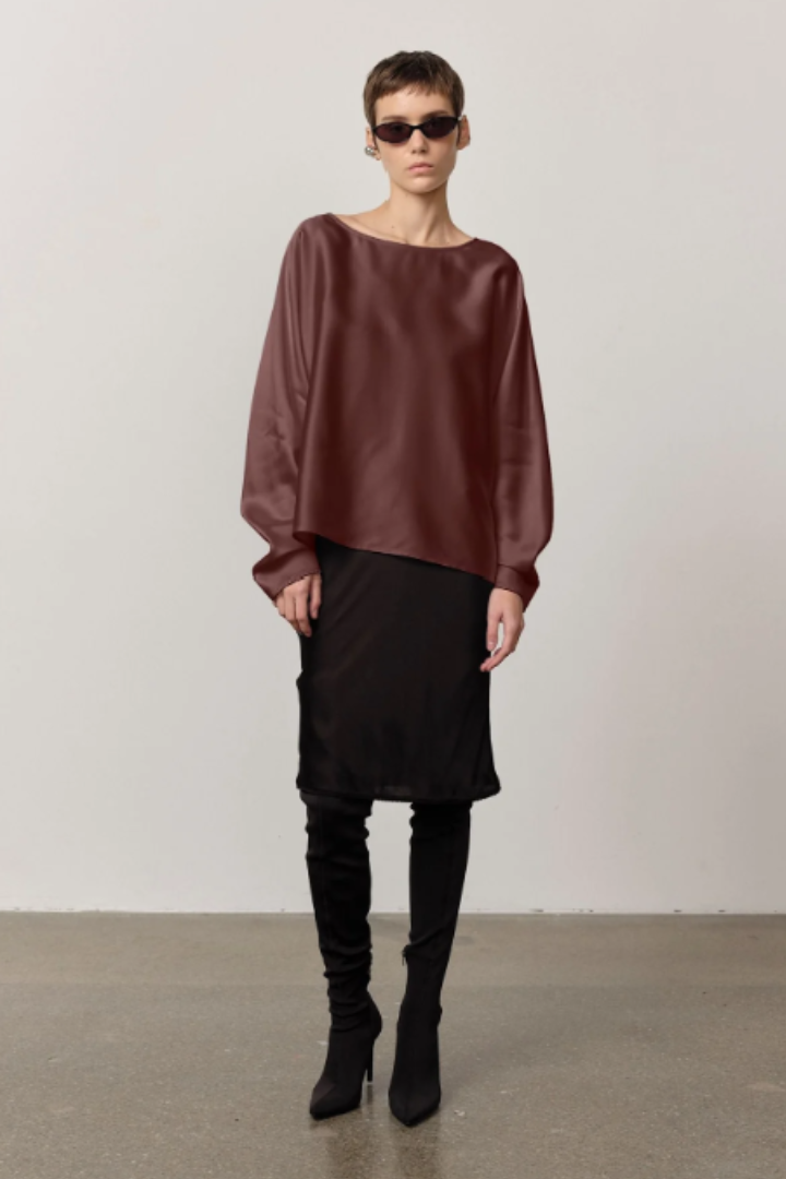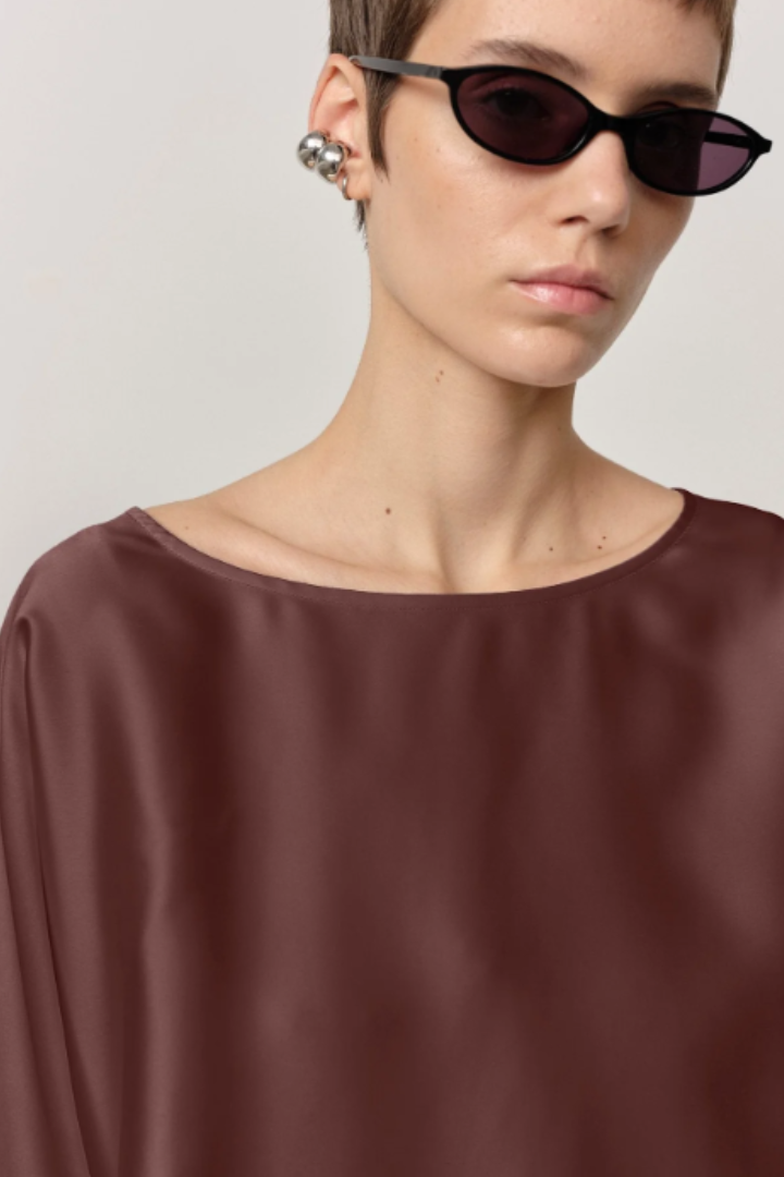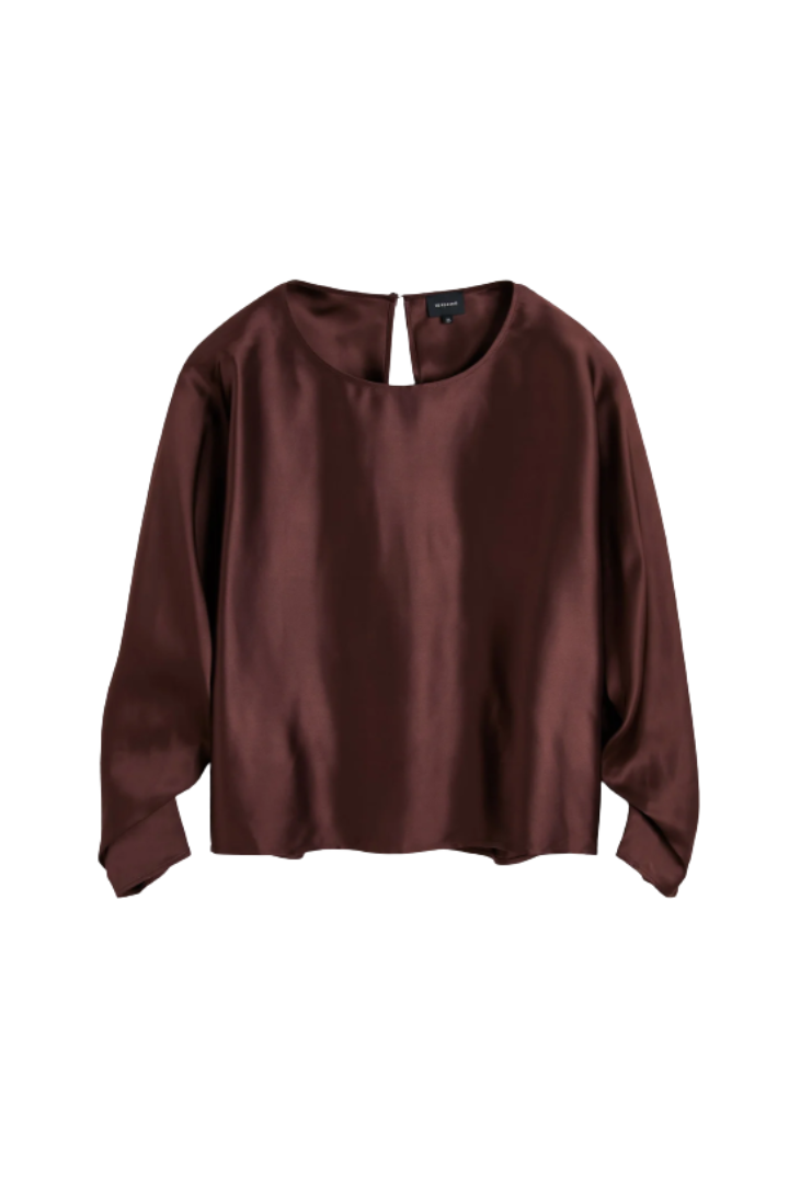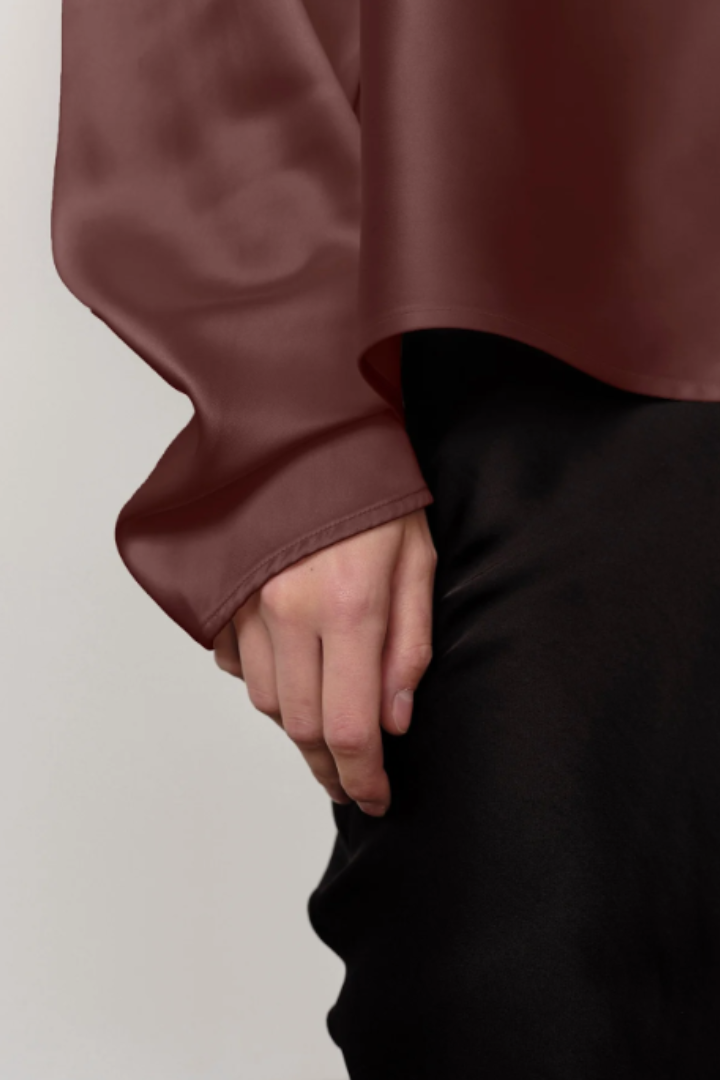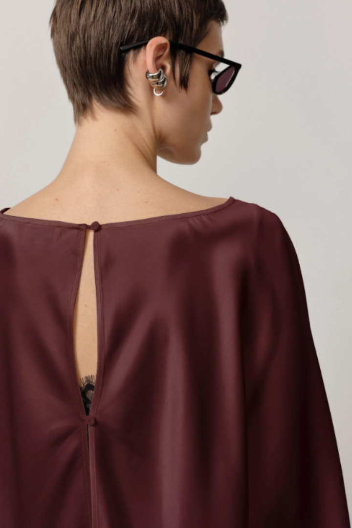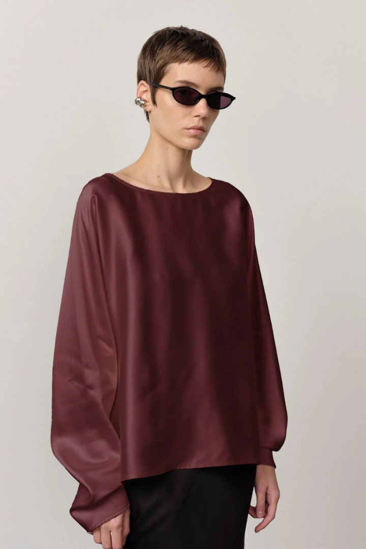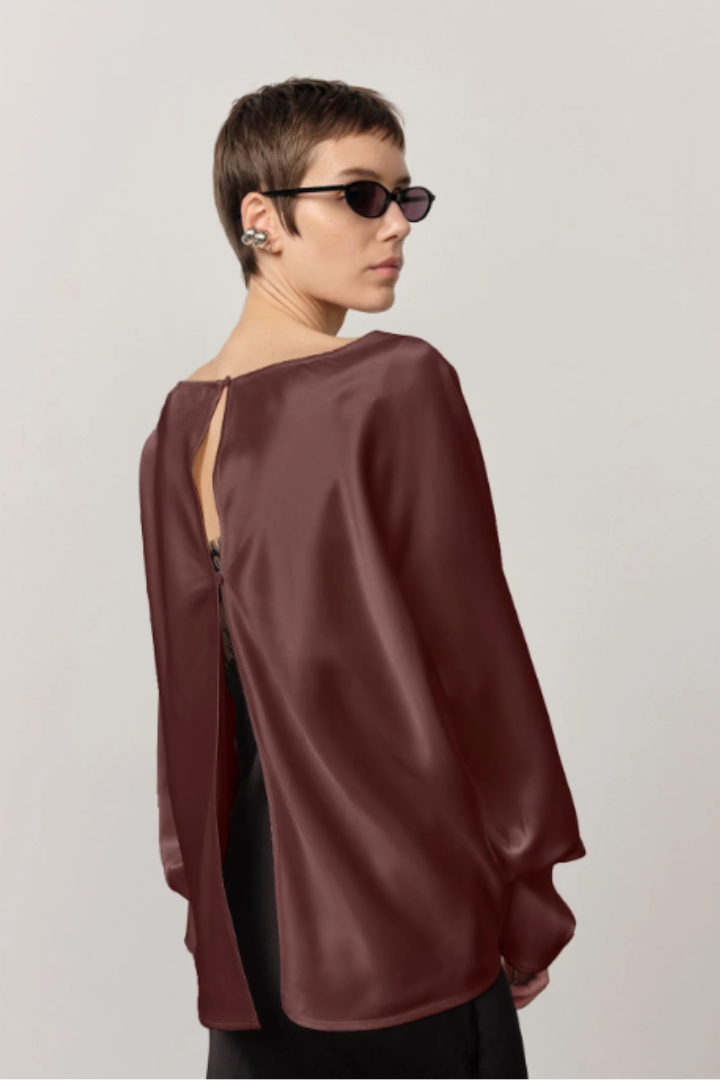 Introducing the Candy Blouse: A loose-fitting blouse with long, relaxed sleeves. The blouse features an open back with a two-button closure, allowing you to adjust the degree of openness.