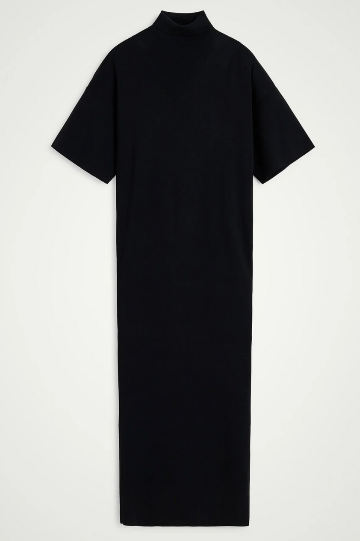 Introducing the Carrie Knit Dress: A long knitted dress that drapes elegantly on the body. The dress features a turtleneck and long loose t-shirt sleeves.