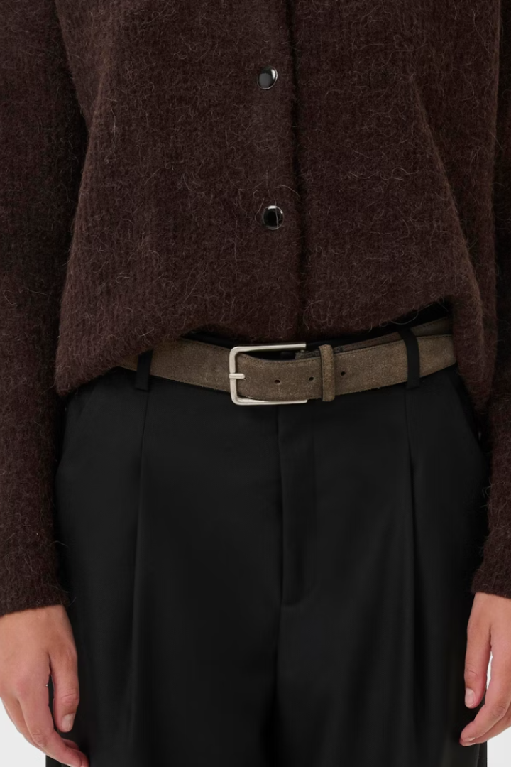 Suede belt with a matte finish, rectangular metal buckle, and classic single keeper design. Clean, minimal look with an adjustable fit for effortless style.