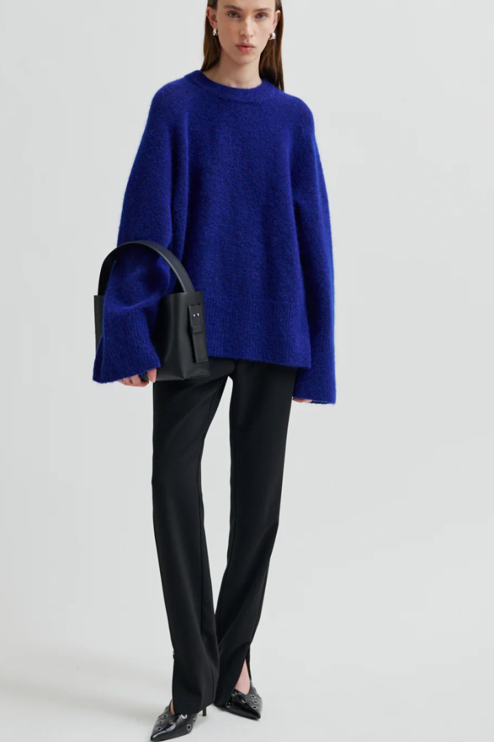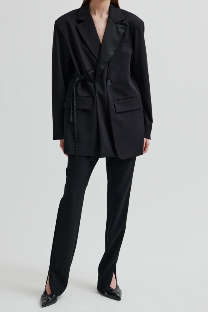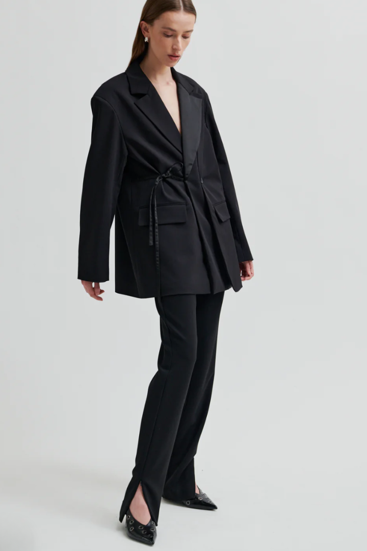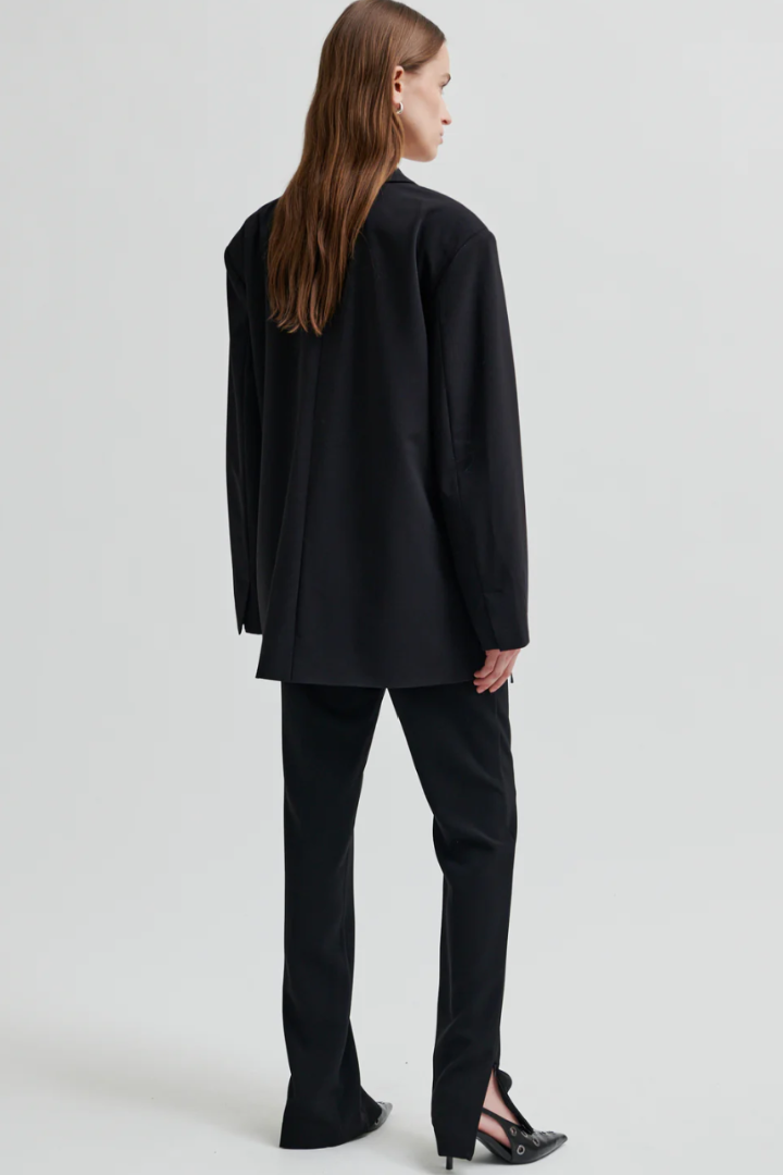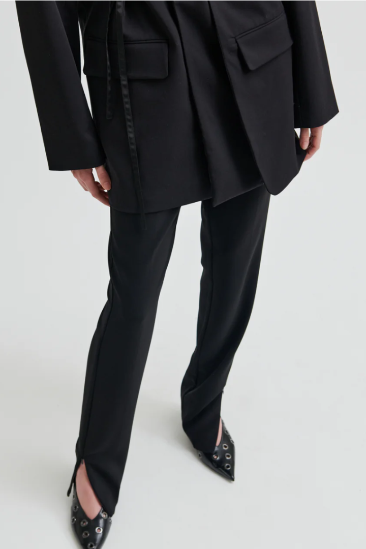 Second Female fitted trousers. The trousers are made in smooth, drapy fabric. Featuring a concealed zip fastening at the side. Fitted seams at the back and zips at bottom hem. Mid waist with fitted leg.