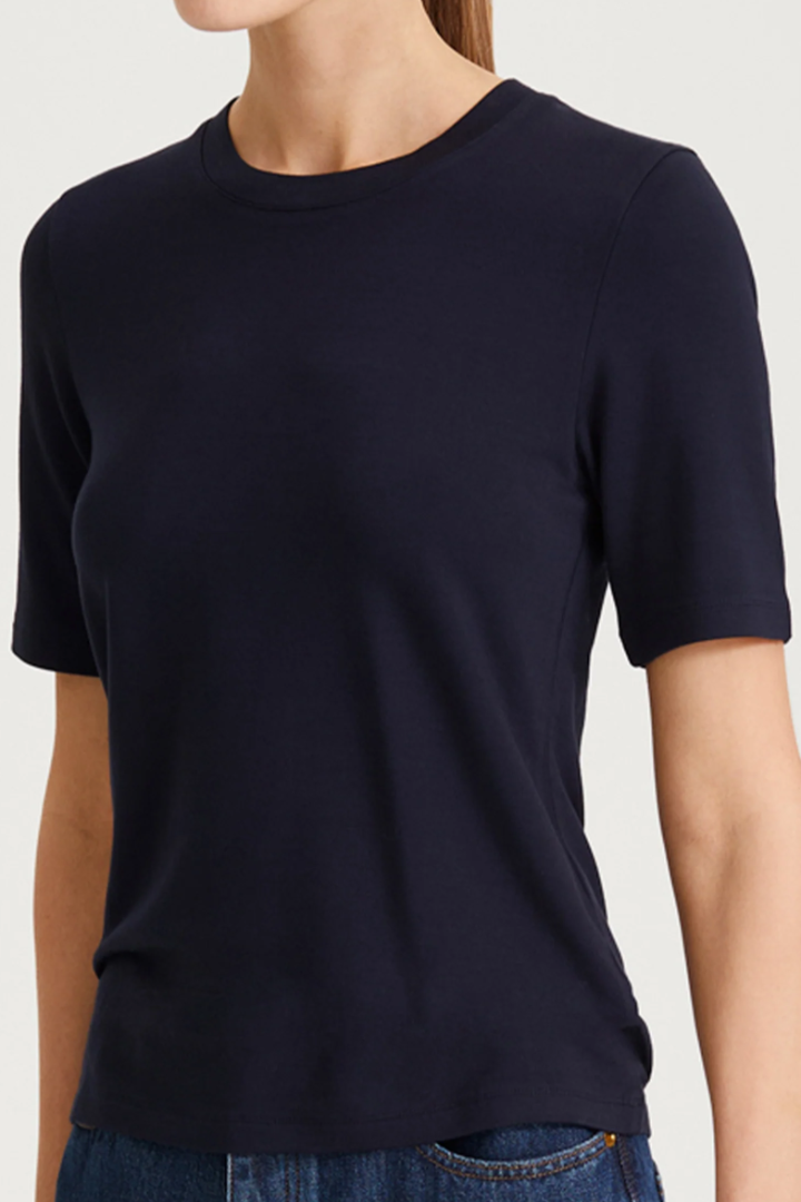 Chambers is Stylein's best-selling basic jersey top, featuring a classic rounded neckline and narrow sleeves. Crafted from a soft viscose jersey fabric, it offers both comfort and timeless style.