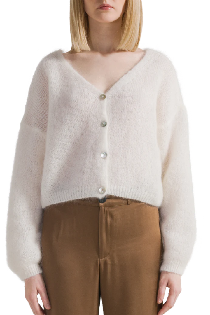 The Cornelia Cropped pullover draws inspiration from our Cornelia LS Cardigan, featuring the same fine, thin mohair knitwear material and button closure. Its cropped length creates an accent at the waist, while the oversized fit adds a trendy and voluminous silhouette.