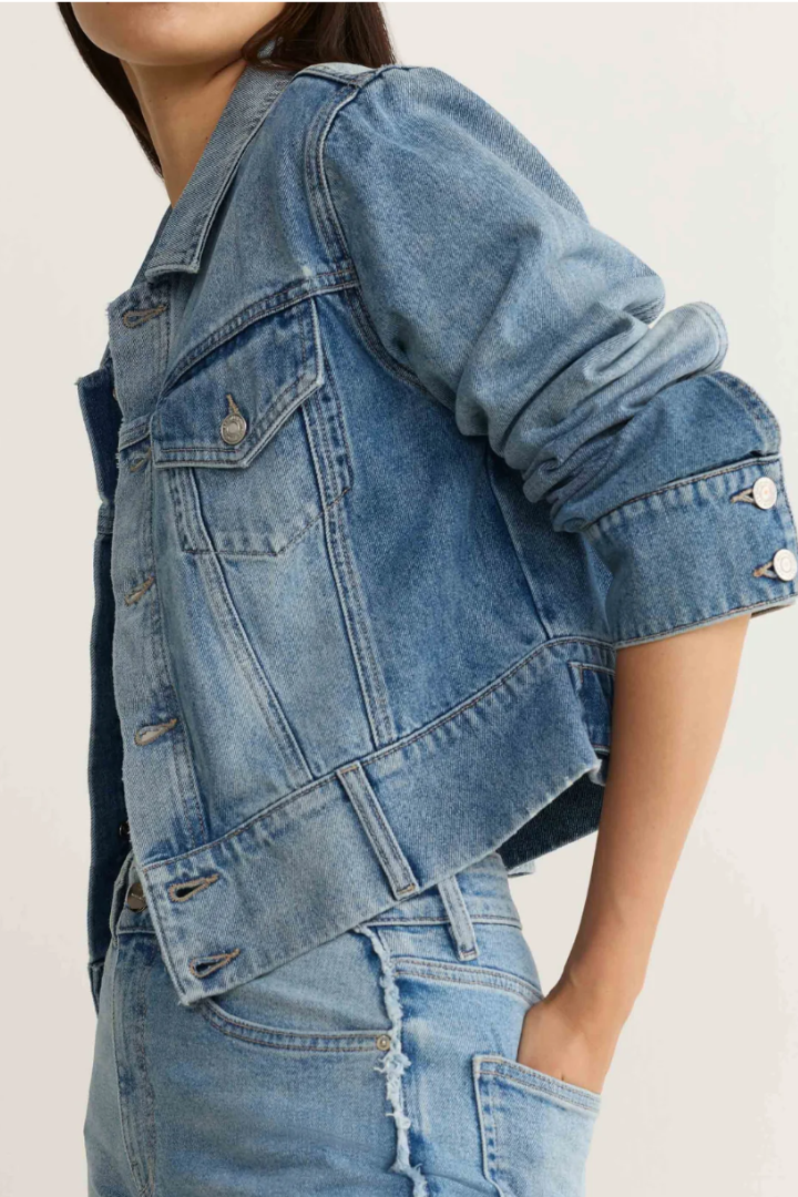 KPB is a classic trucker-inspired denim jacket with long sleeves and a cropped length.