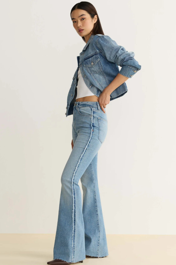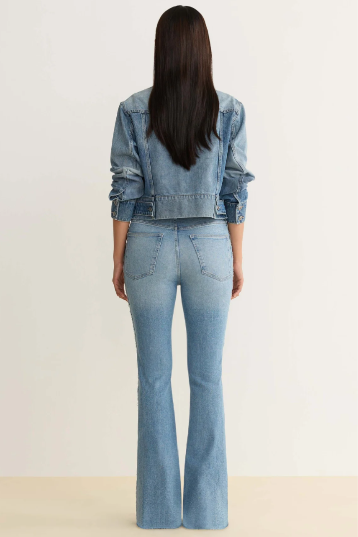 Bambino is a vintage-inspired light wash with grinding at the hem and silver hardware.