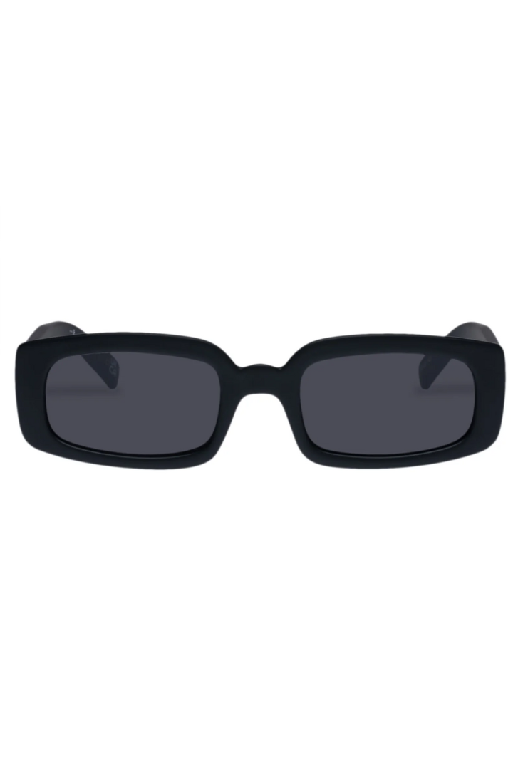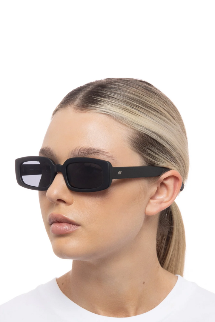 Designed with narrow proportions and wide fit for all face sizes, our DYNAMITE rectangular frame sunglasses are a wardrobe staple for both guys and girls. Featuring a classic noughties-inspired look, this unisex sunglass features discreet Le Specs metal stud detailing on both temples.