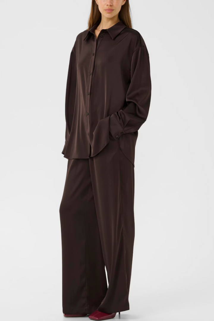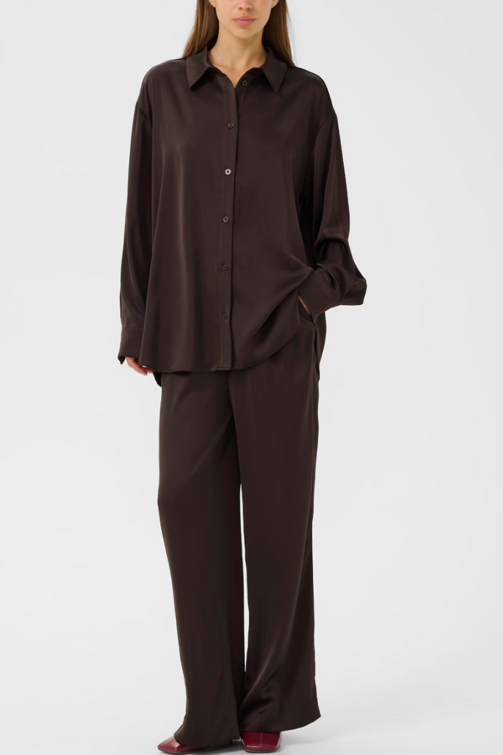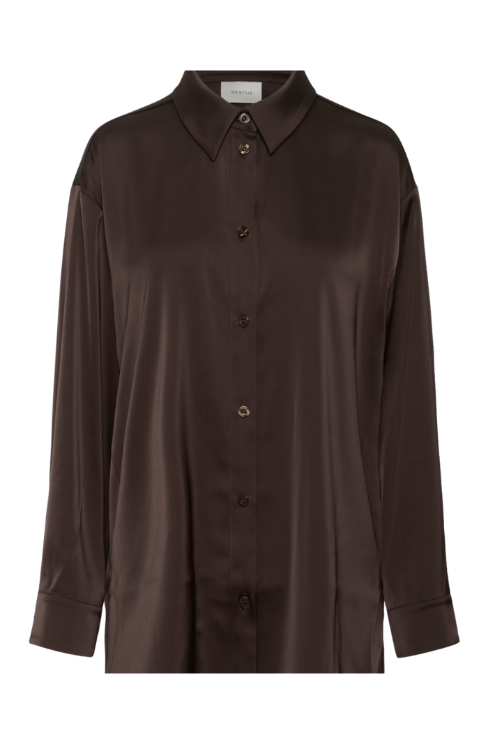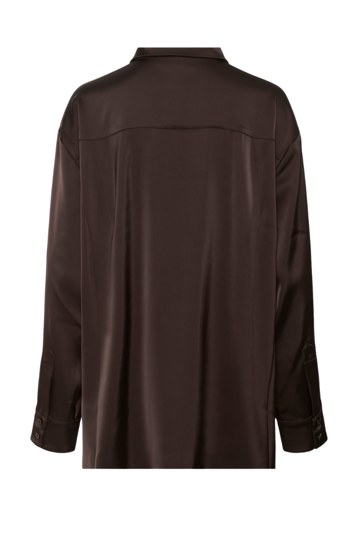 This women's relaxed satin shirt features a loose fit and classic collar, offering all-day comfort. The button-down design and long sleeves provide versatile styling for work or casual occasions.