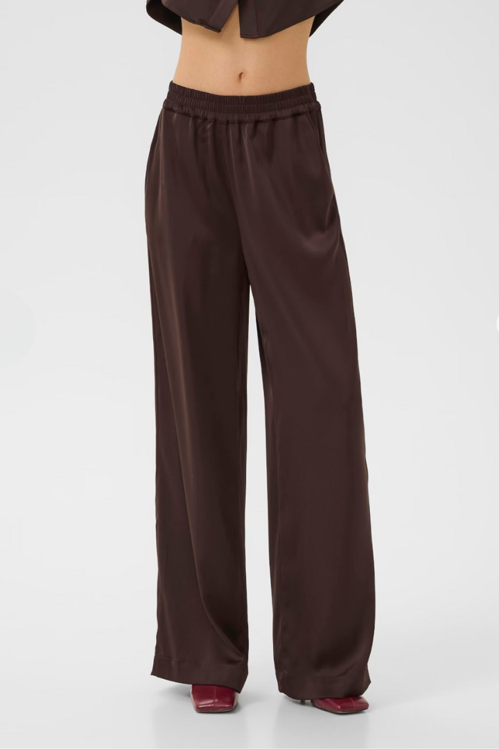 Trousers in glossy fabric with an elastic waist. The design features straight, wide legs and side pockets. The model is 179 cm tall and is wearing size S/36.