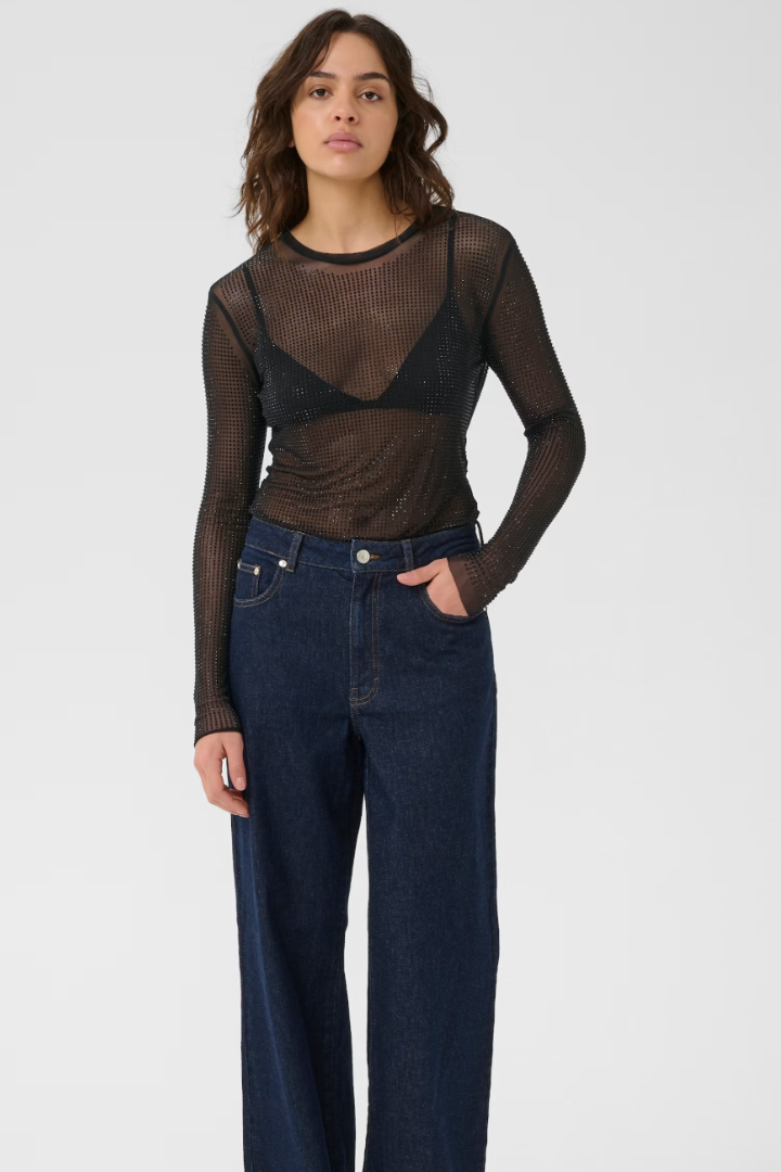 Long-sleeve mesh top with a sheer finish and all-over rhinestone embellishment. Designed with a round neckline and fitted shape, creating a modern and eye-catching look. The model is 175 cm tall and is wearing size S/36.