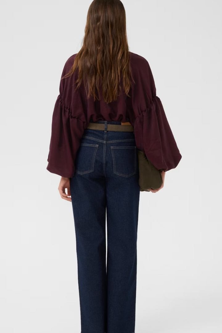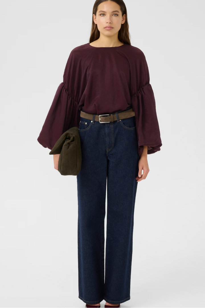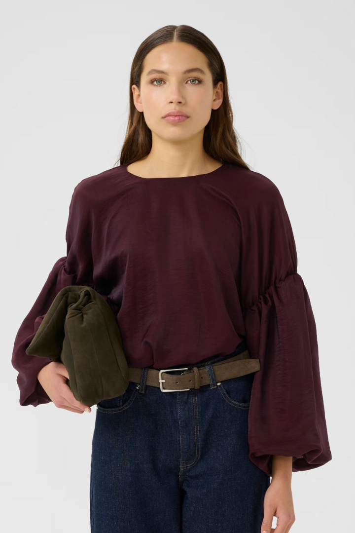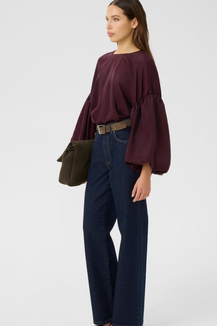 Blouse in glossy fabric with a round neckline and long, wide sleeves. The sleeves feature gathered details that create a light and elegant drape. The model is 175 cm tall and is wearing size S/36.