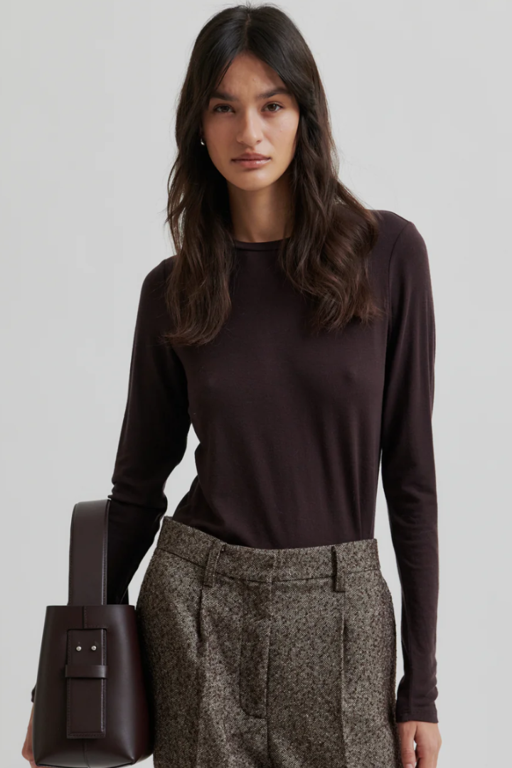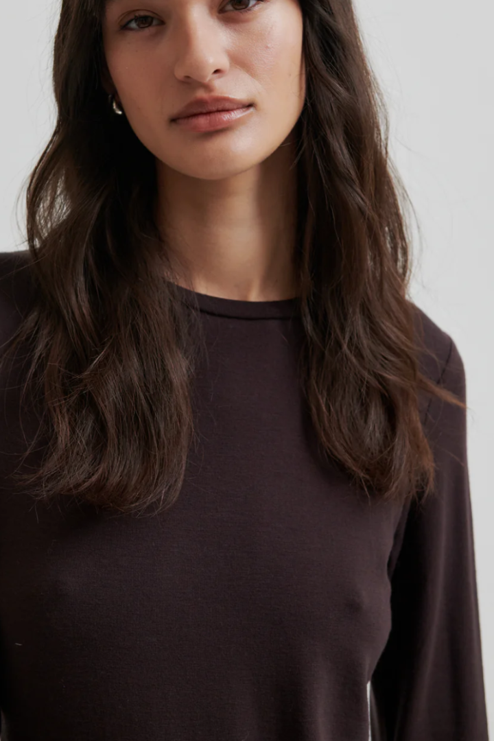Second Female merino tee. The tee is made in a soft and stretchy merino blend. Featuring a round neck and long sleeves. Tight fit that offers next-to-skin comfort.