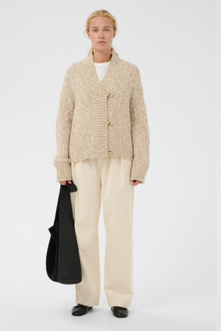 Chunky knit cardigan with a softly textured finish, relaxed silhouette, high-low hem, and oversized ribbed shawl collar. Features long sleeves and three visible front buttons.