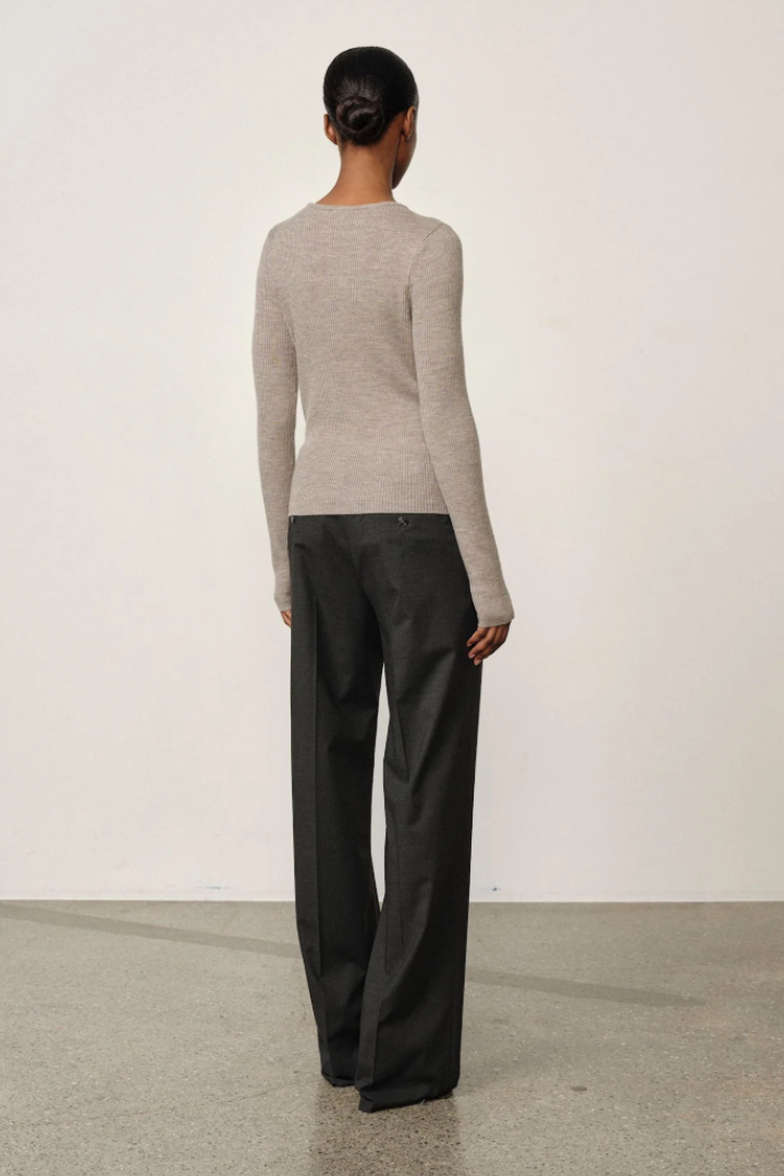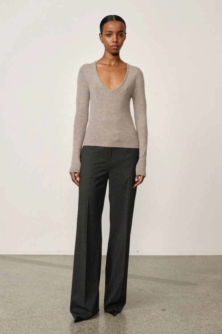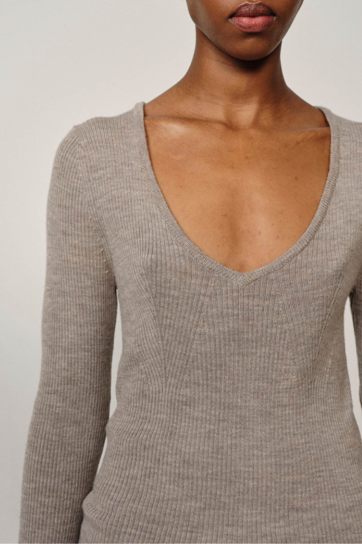 Intoducing the Nova Knit Blouse: A long-sleeved knitted blouse featuring a regular fit and a deep V-neck.