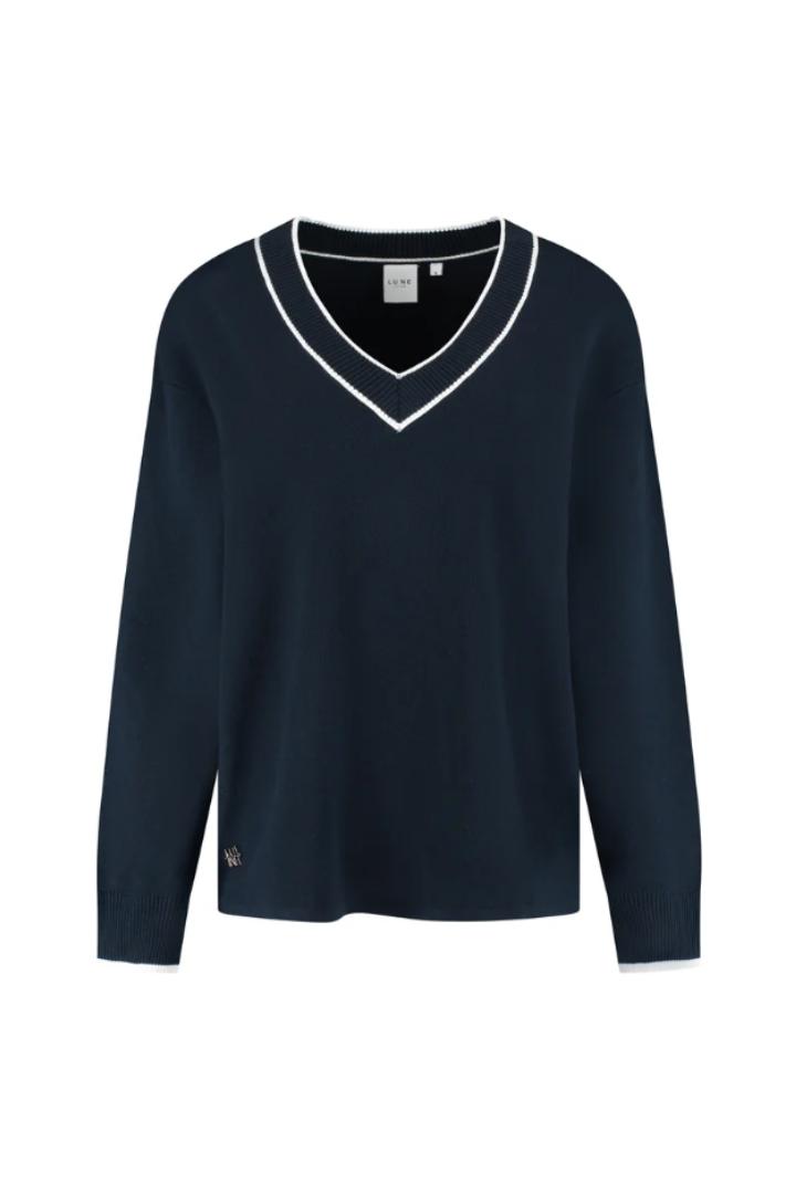 The Olly V-Neck Sweater has a relaxed fit with subtle contrast detailing at the neckline. Made from Ecovero viscose, it offers softness and warmth with a versatile, modern look.