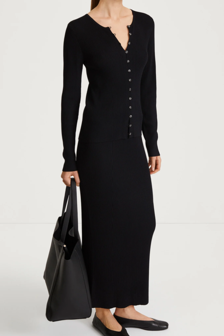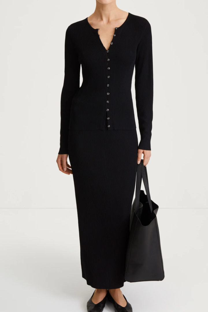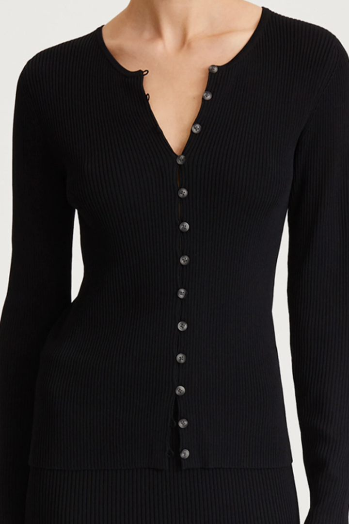 Paloma is a finely ribbed, fitted cardigan crafted from a soft rayon blend. Designed with a rounded neckline and tonal horn buttons, it features elastic loops in place of traditional buttonholes for a delicate finish.