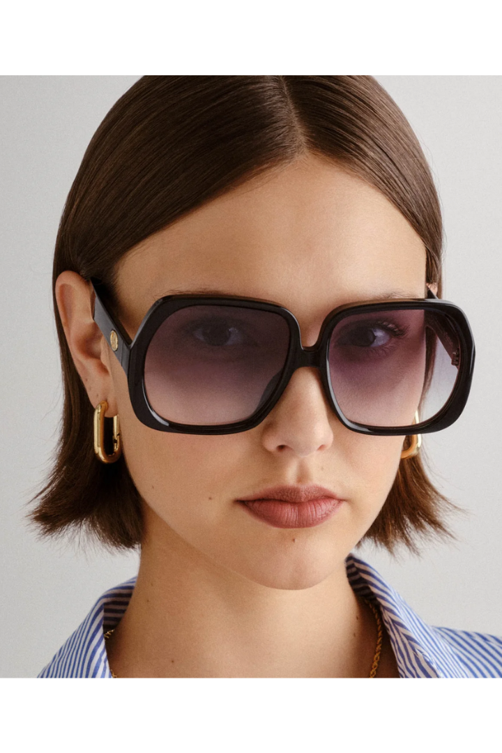 Featuring exaggerated curved lines, our POLYDISCO sunglasses are a nod to vintage charm and contemporary flair. Designed with an oversized look and unique temple shape, these glamourous frames are finished with an opulent bespoke oval flagstripe hardware to both temples.