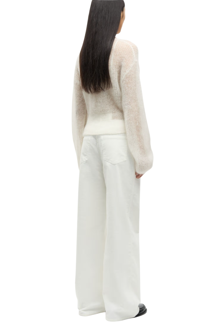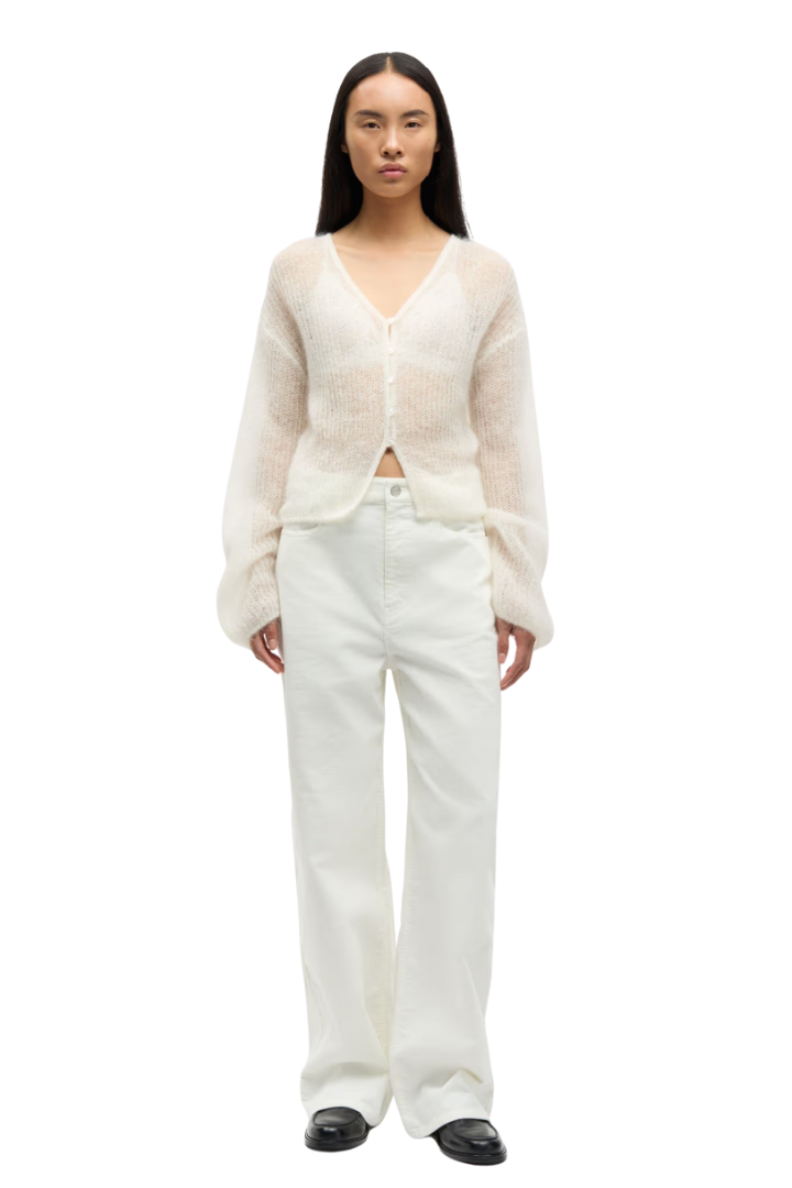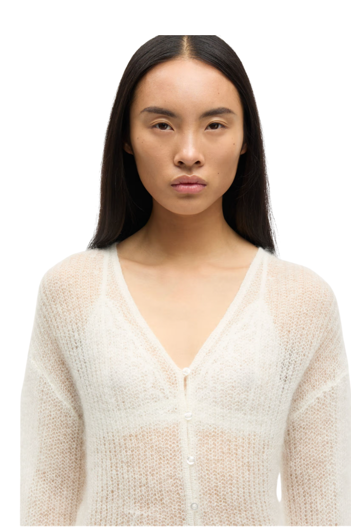 Cardigan with a loose fit, dropped shoulders, and fitted waist. Button closure on the front. Rib-knitted hem. V-neck. Main material made from a blend including mohair and wool. This product is RWS certified. The RWS describes and certifies animal welfare and land management practices in wool fibre production and tracks the certified material from farm to final product.
