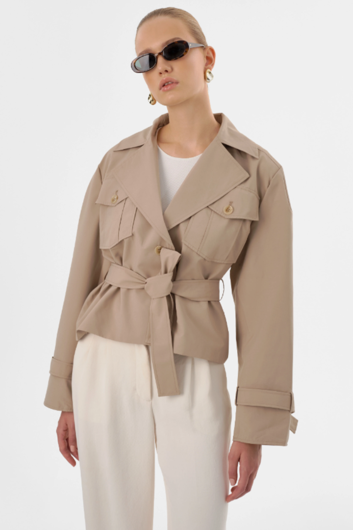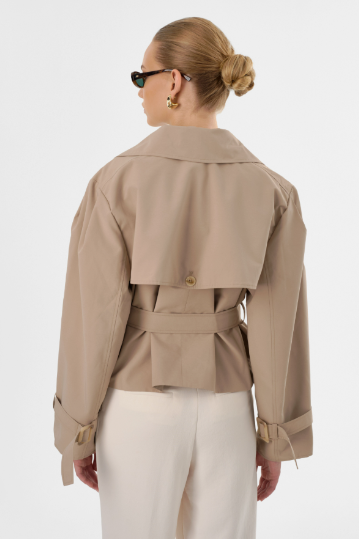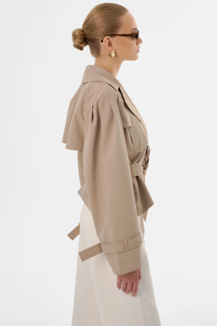 The QUINN Cropped Trench Coat reimagines a timeless silhouette with a chic, modern spin. Featuring a defined waist and voluminous sleeves, it offers a refined statement piece. Perfect for the fashion-forward woman seeking a versatile outer layer, this jacket brings polished style to every look.