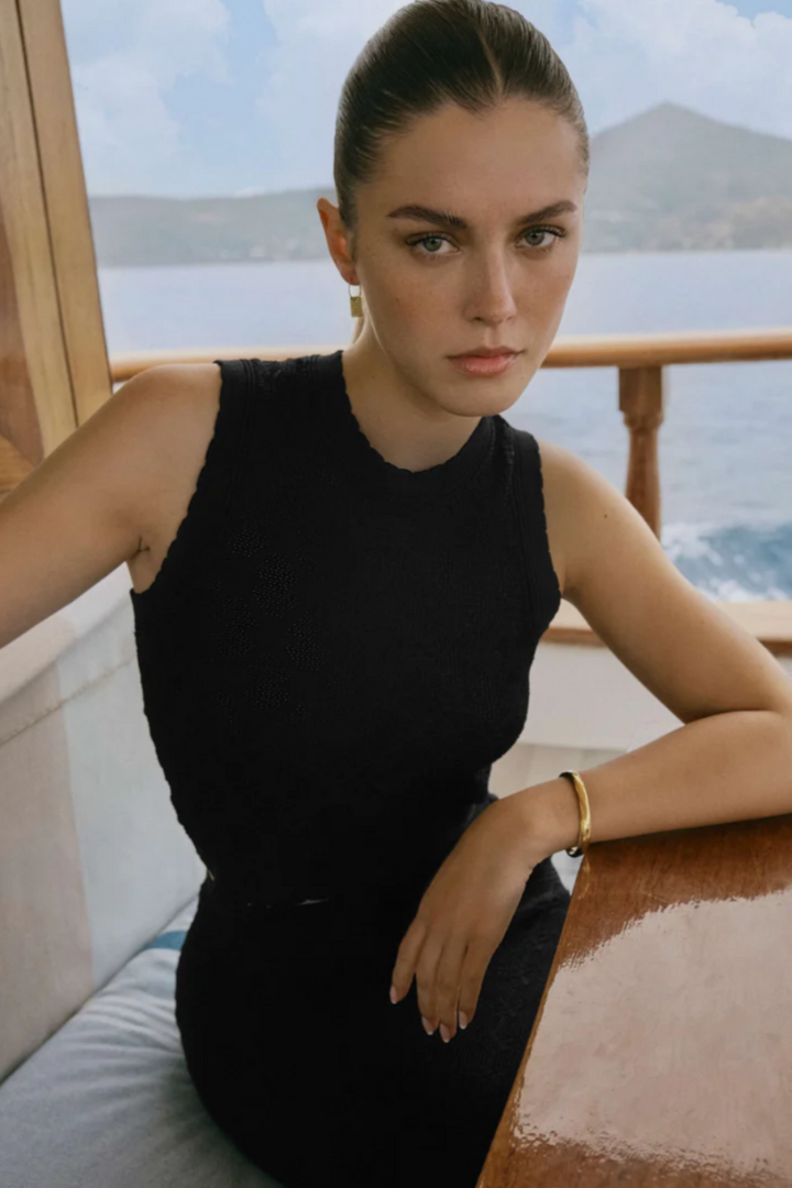 This crewneck tank features a dimension jacquard knit fabric, making it go from day to night effortlessly. Pair it with the Ramona Sweater Skirt for a perfect look.