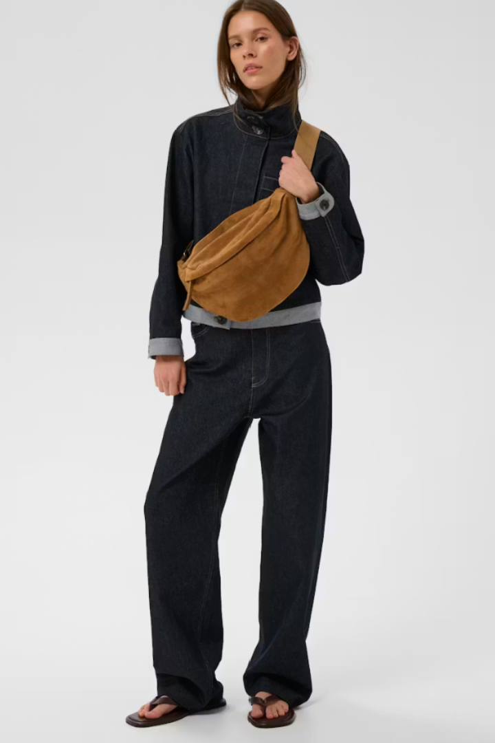 This sling bag features a curved, oversized silhouette with a textured soft finish. Wide adjustable strap and practical zip closure add functionality and an urban edge.