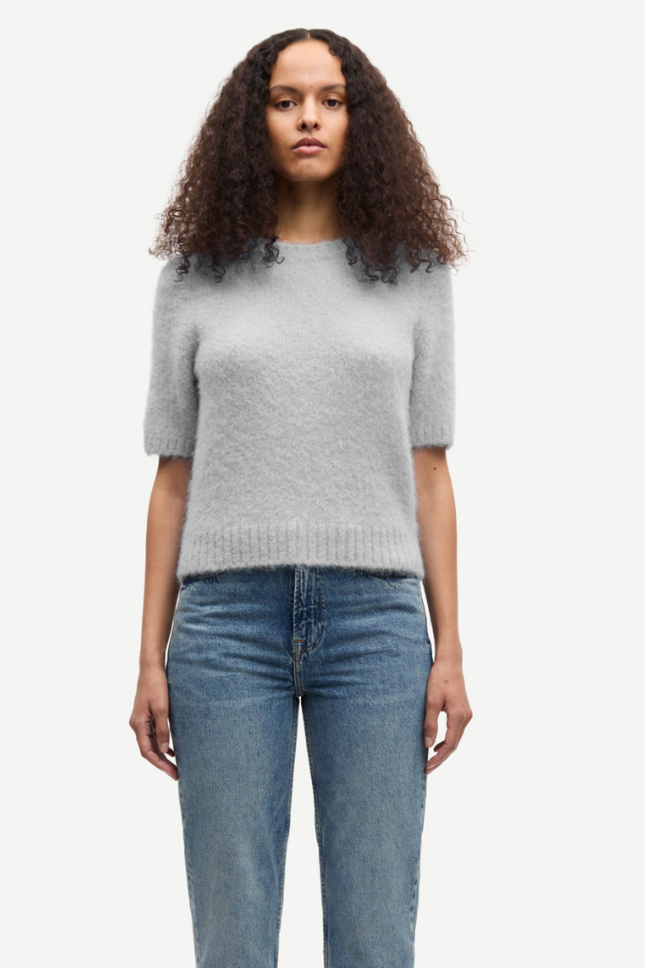 Short-sleeved sweater with a regular fit and cropped silhouette. Rib-knitted collar, cuffs, and hem. Round neck. Brushed look. Main material made from an elastic blend including alpaca wool.