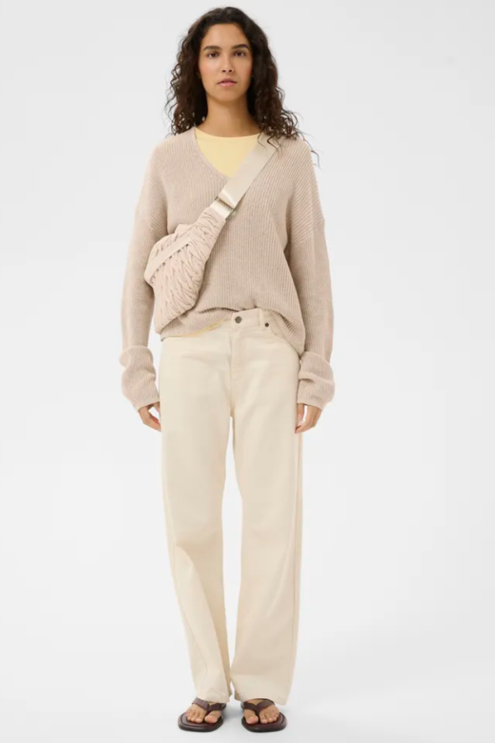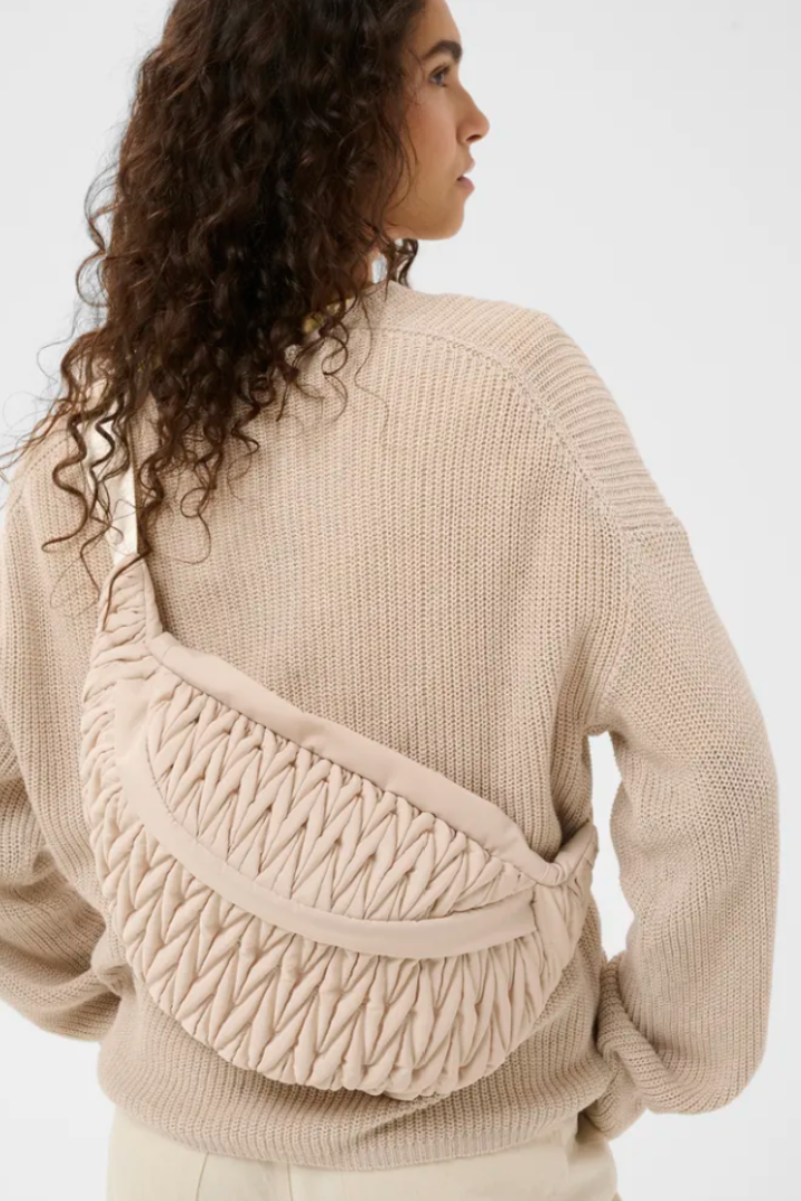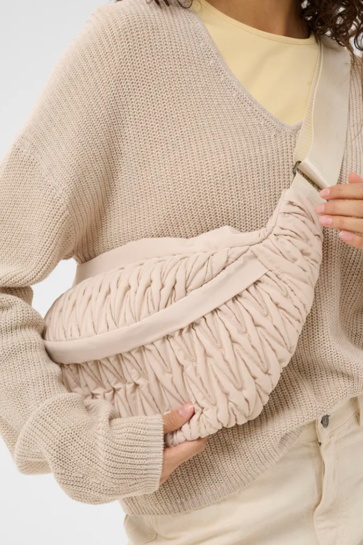 Sling bag with crinkled textured finish and generous curved silhouette. Features an oversized, adjustable webbing strap and a visible top zip closure.