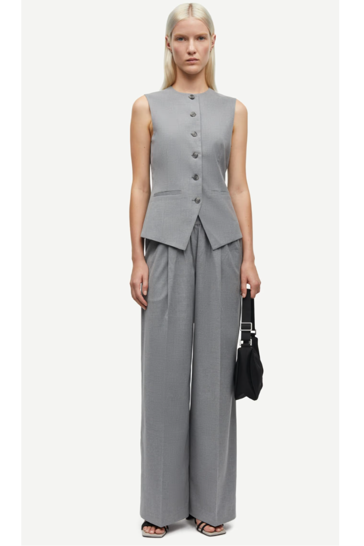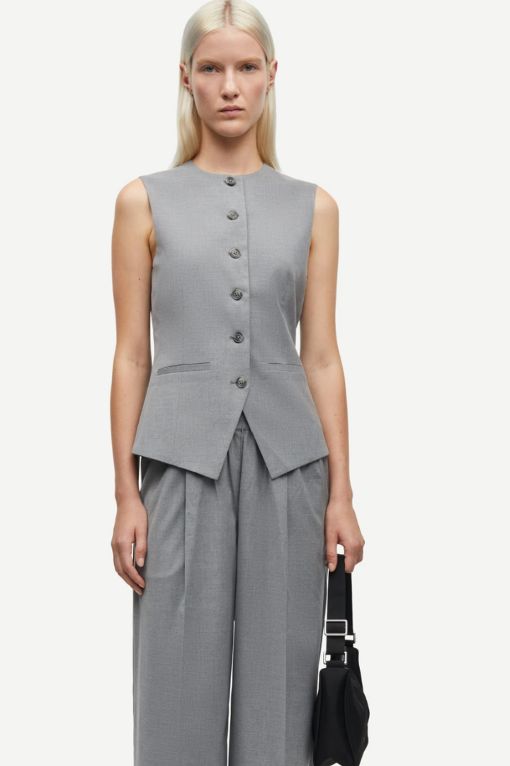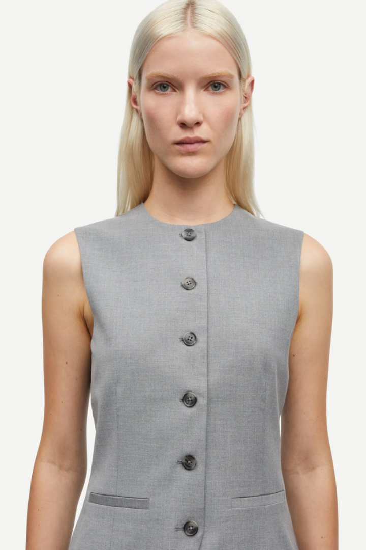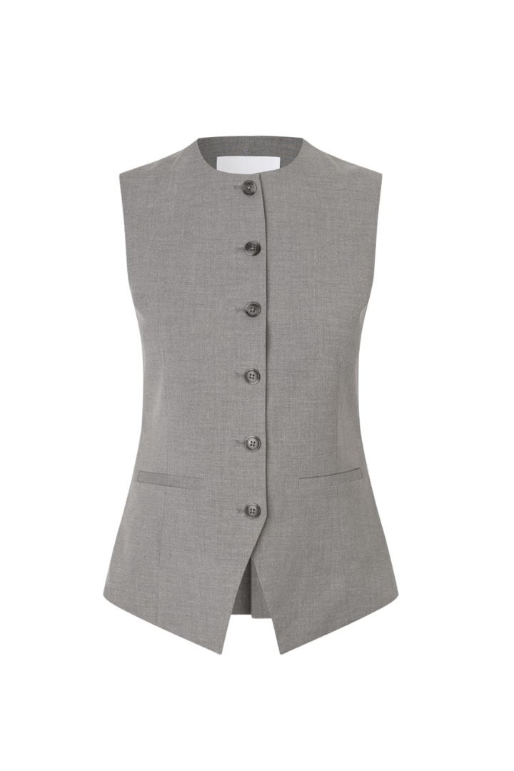 Vest with a regular fit. Button closure on the front. Faux welt pockets on the front. Round neck. Vent at the back. Main material made from an elastic blend including recycled polyester. This product is GRS certified. Each stage of the supply chain has met strict social, environmental, and chemical requirements.