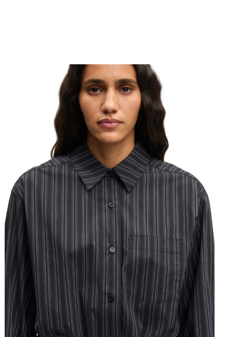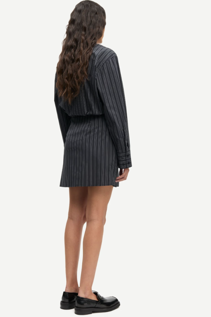 Pinstriped long-sleeved mini shirt dress with a regular fit and straight skirt. Button closure on the front and tie closure at the side. Patch pocket at the chest. Pointed collar and plain back. Main material made from an elastic cotton blend including organic cotton.