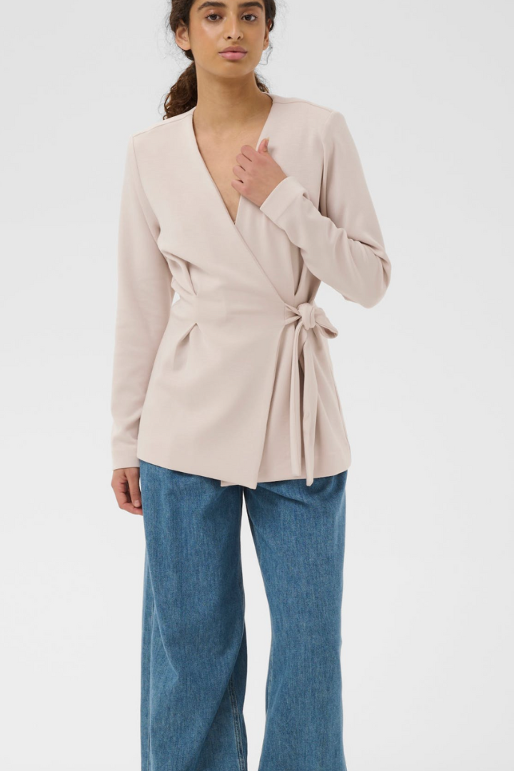 Wrap blazer with a minimalist look, deep V-neckline, long sleeves, self-tie waist and straight hem. Flattering regular fit with a soft, smooth appearance.