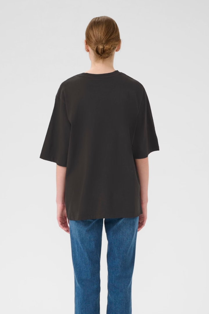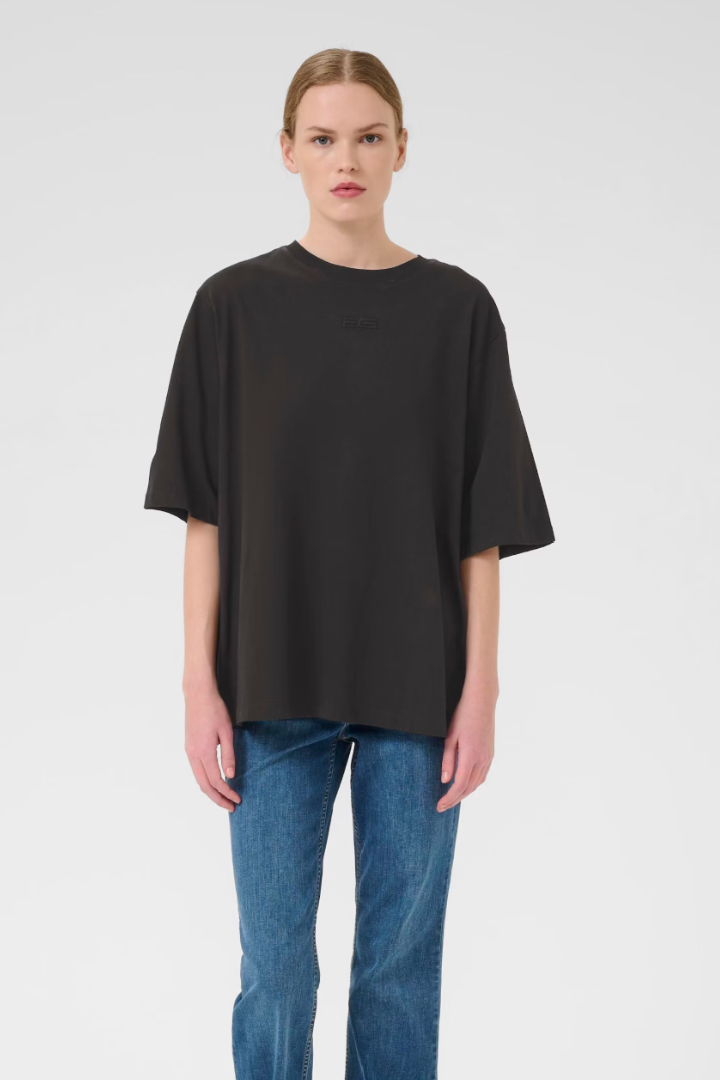 Relaxed-fit T-shirt with dropped shoulders and wide sleeves for a casual silhouette. Features a classic crew neckline and tonal front logo detail. Crafted from soft, breathable fabric for everyday comfort.