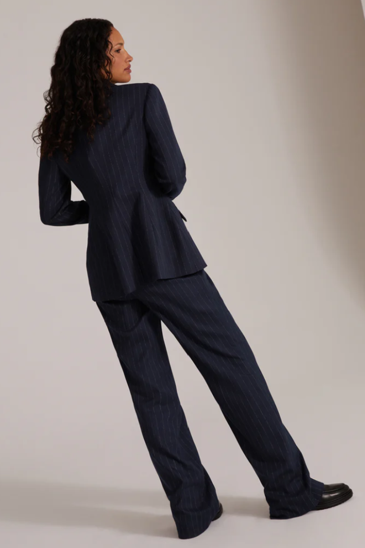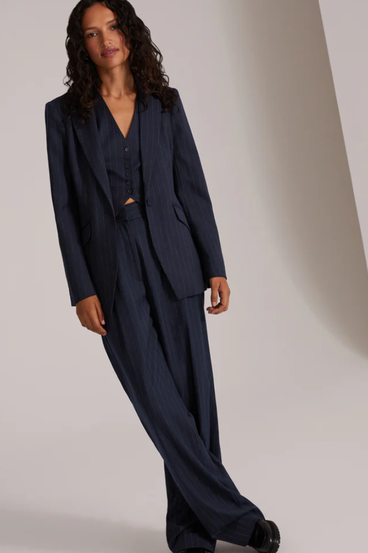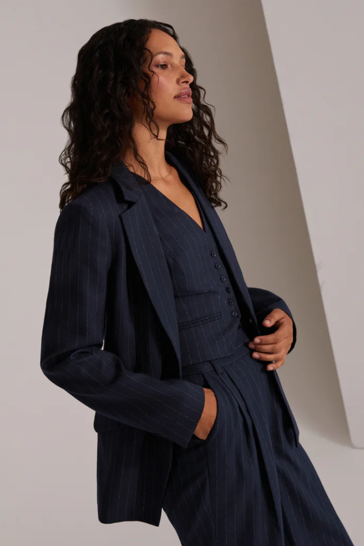 Our single button blazer could be our single most favorite layer. Crafted in navy pinstripe in a blend suiting fabric, The Favorite Blazer has a contoured waist so it hangs beautifully and gives just enough shape and structure. We wear it with everything (yes, everything) but we swoon over the suiting set when paired with The Favorite Vest.