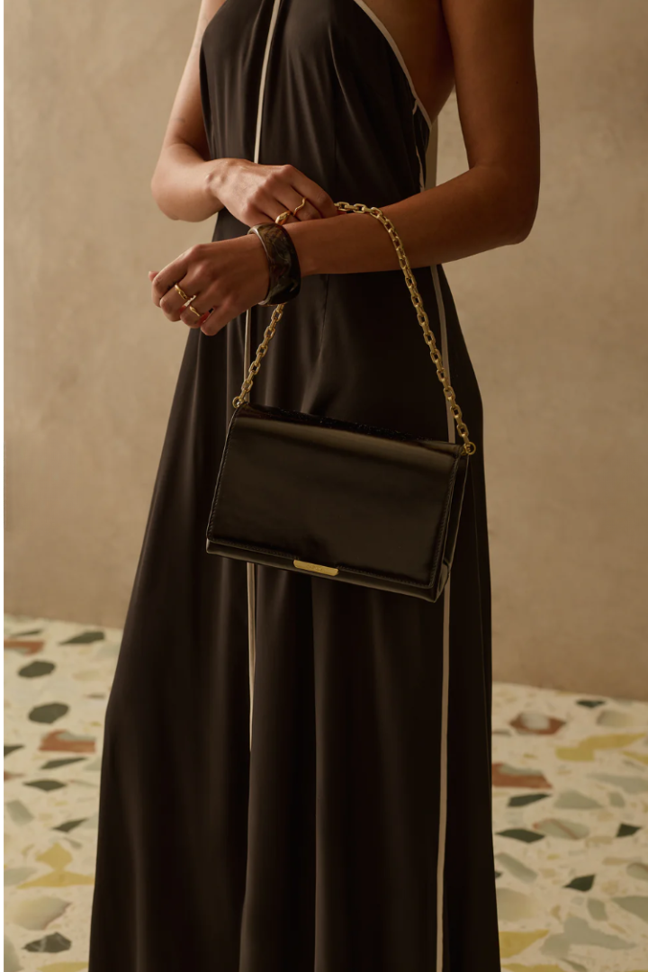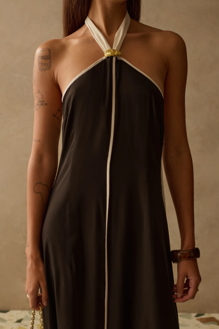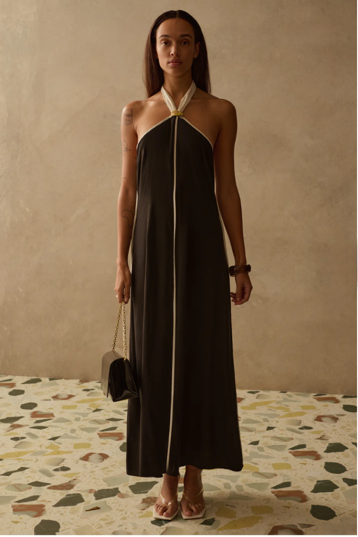The Savannah Dress is a play on a classic slip dress with more body. Featuring contrast panel lines and beautiful halter neck, this sophisticated piece with its floaty silhouette, is perfect for those that like a relaxed fit dress that they can feel comfortable yet stylish in. Pair yours with our Sirolo Bag.