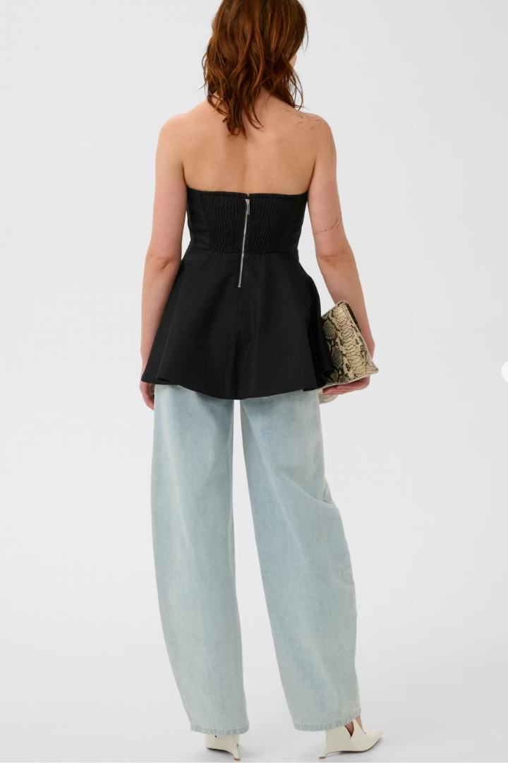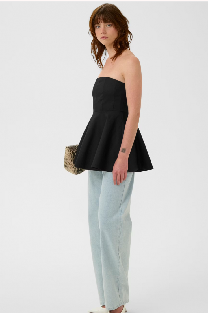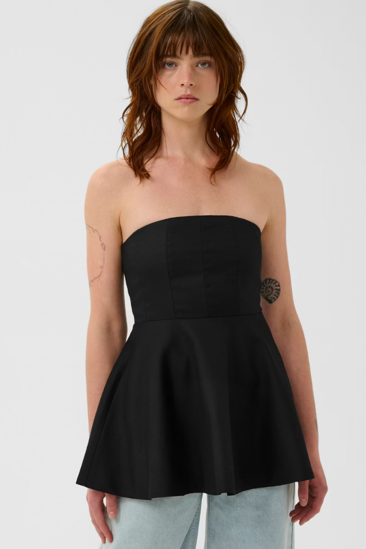 Discover this strapless peplum top for women, designed with a fitted bodice and flared silhouette for elegant comfort. The structured neckline and sleeveless cut offer a flattering fit, ideal for both formal and casual occasions.