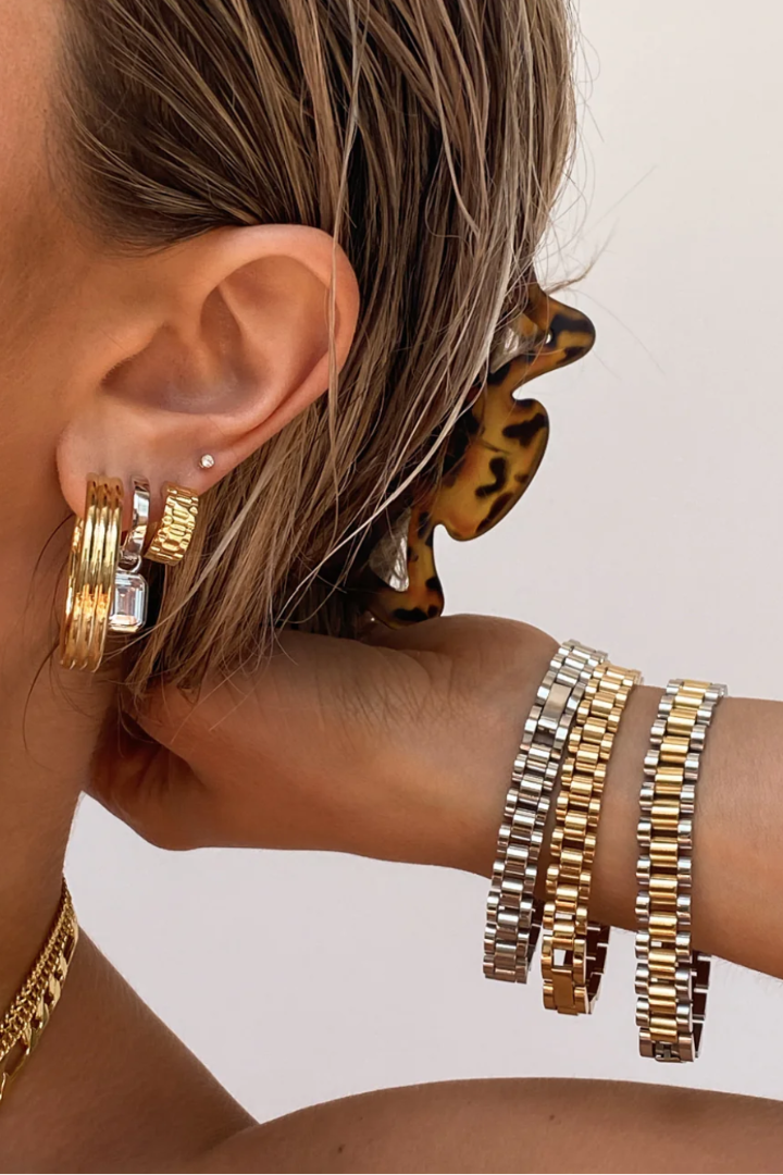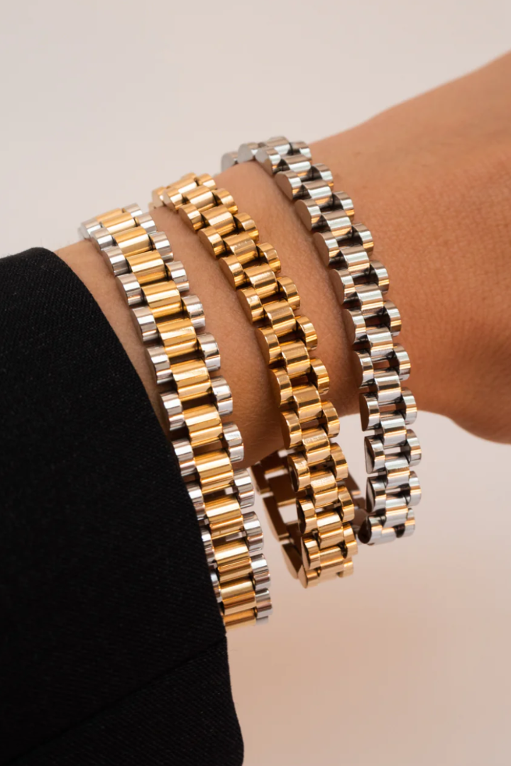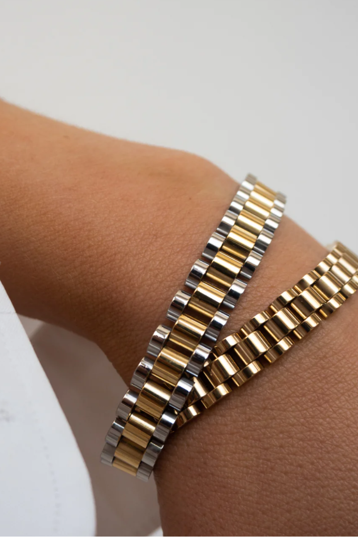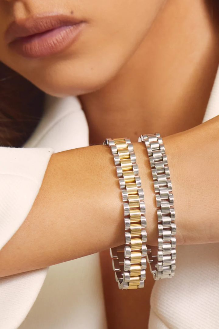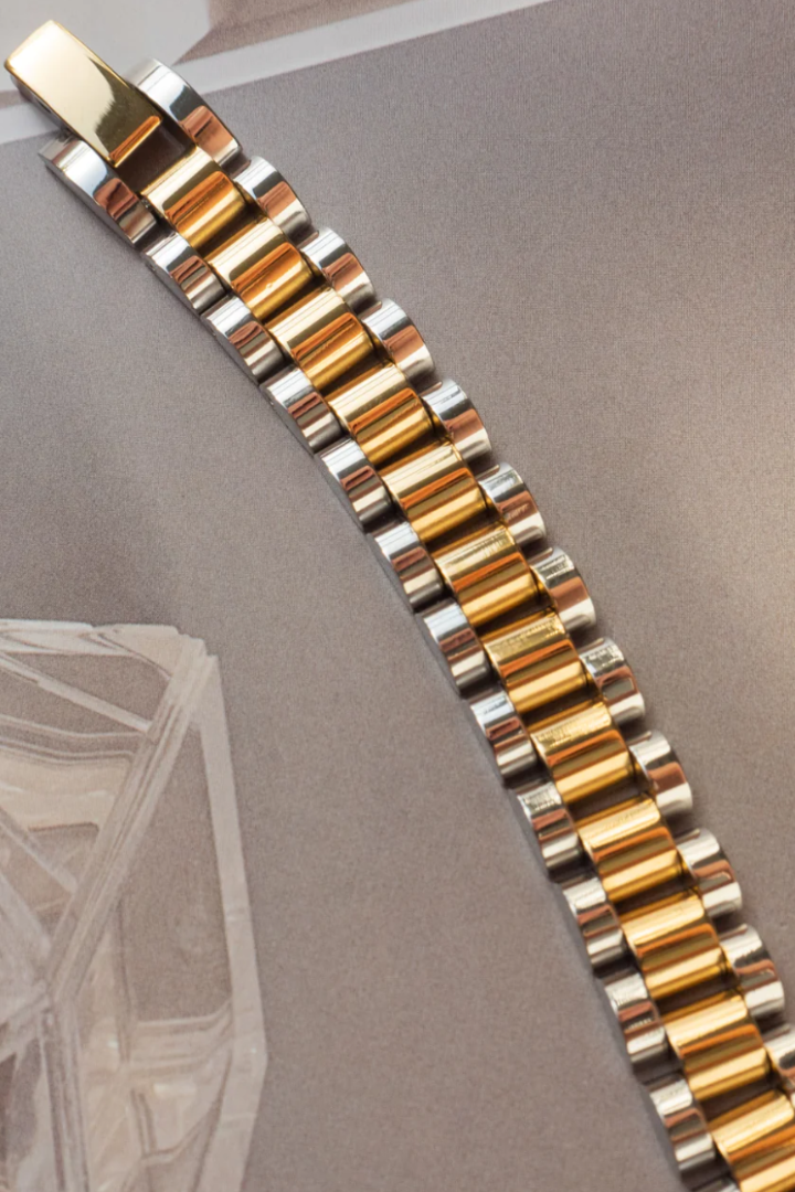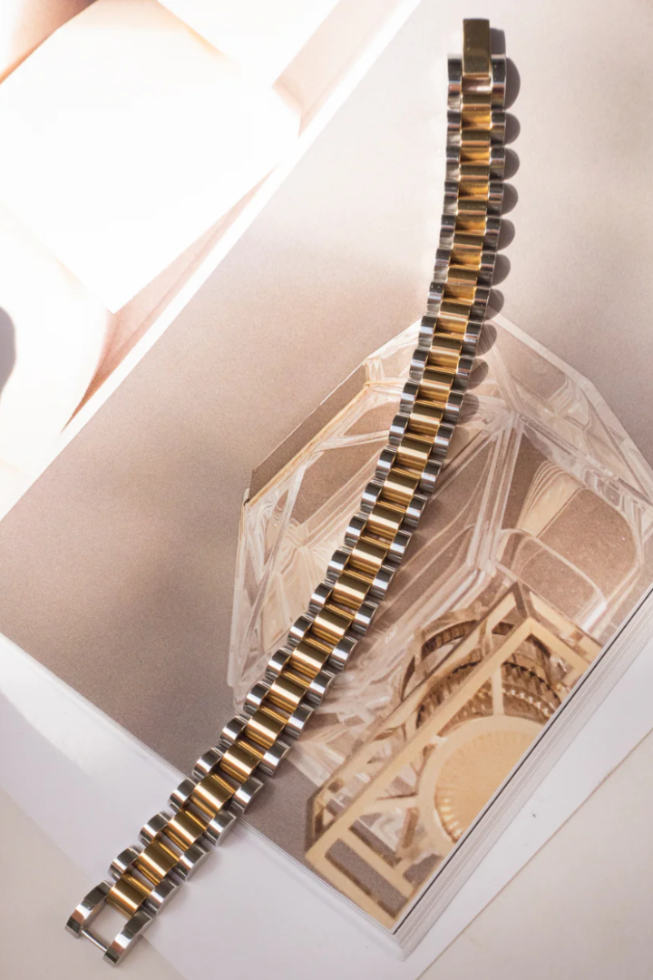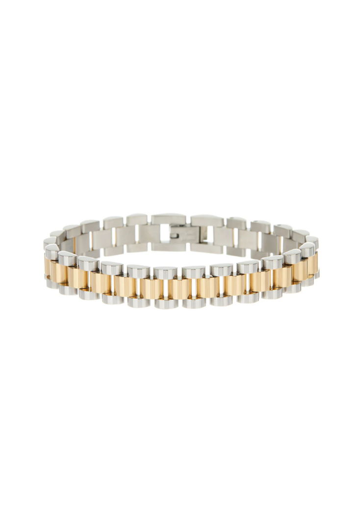 - Two-toned, brushed metal timepiece bracelet