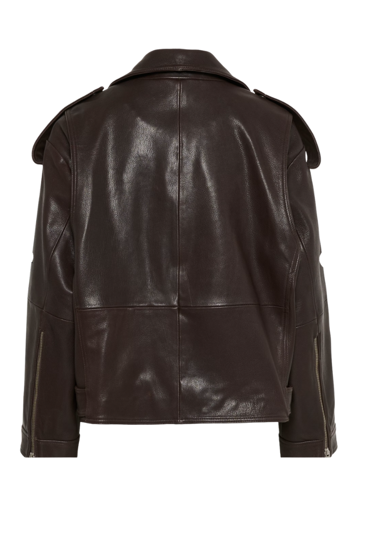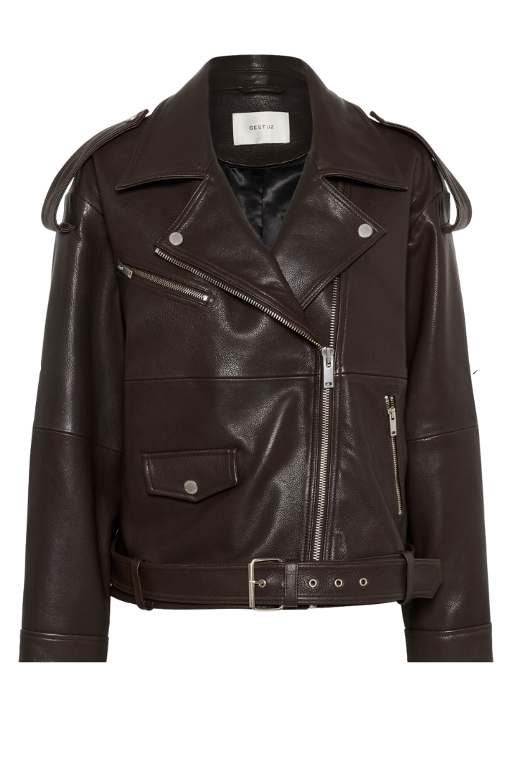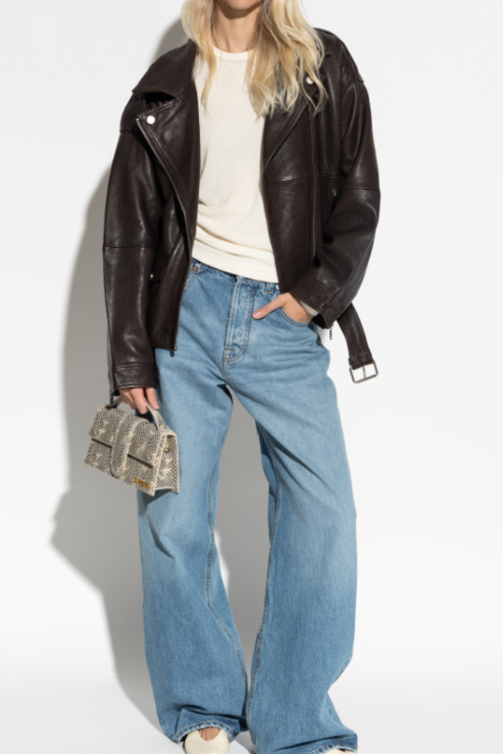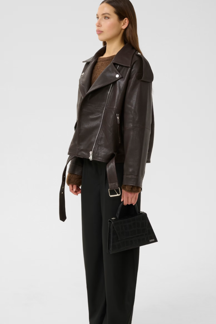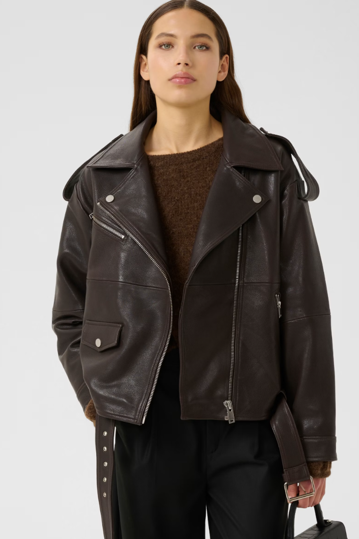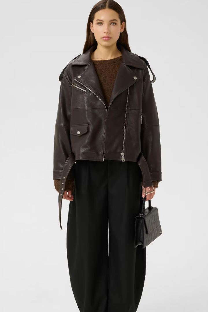 Biker jacket in genuine leather with asymmetric zip closure and wide collar. The jacket features zip pockets, shoulder straps and an adjustable waist belt. The model is 175 cm tall and is wearing size S/36.